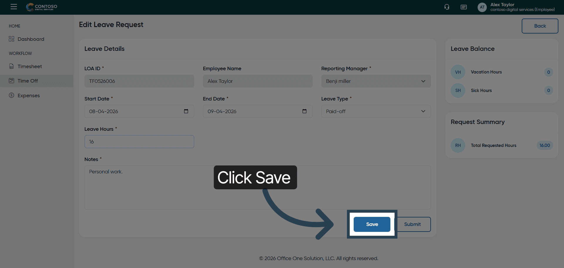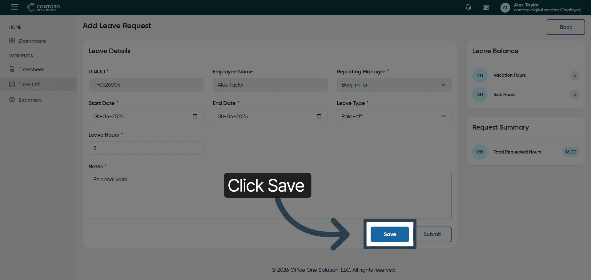 Click the Save button to store your leave request.
