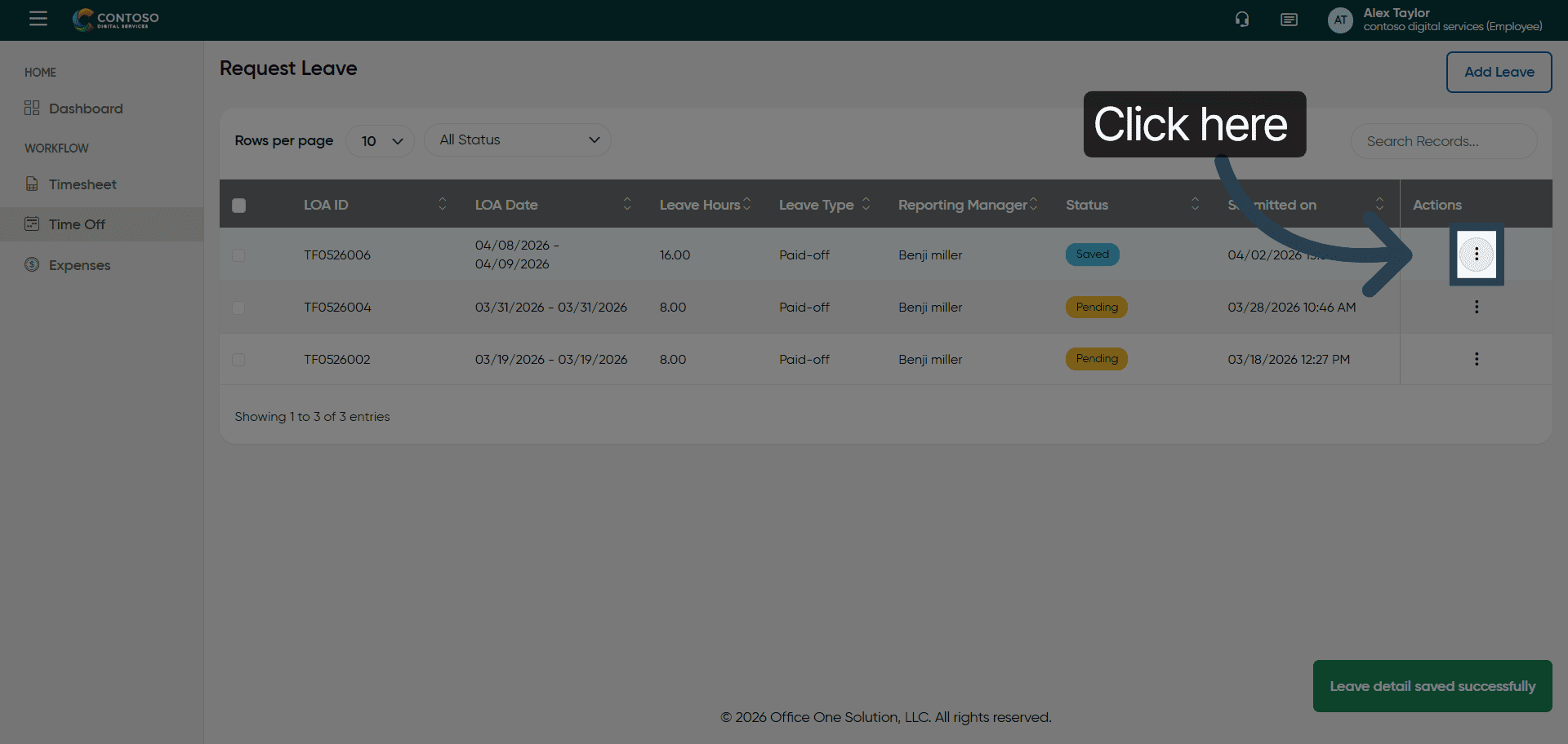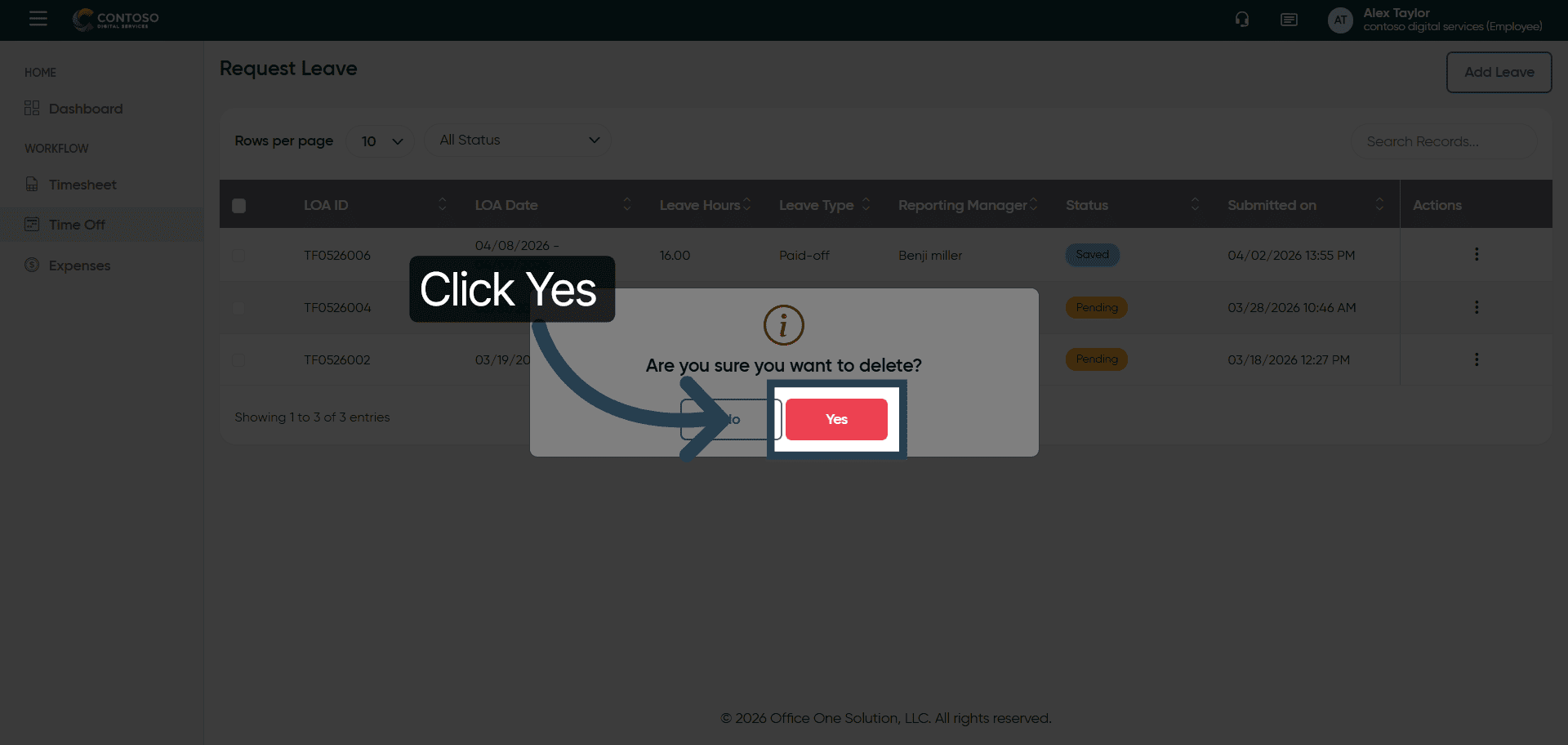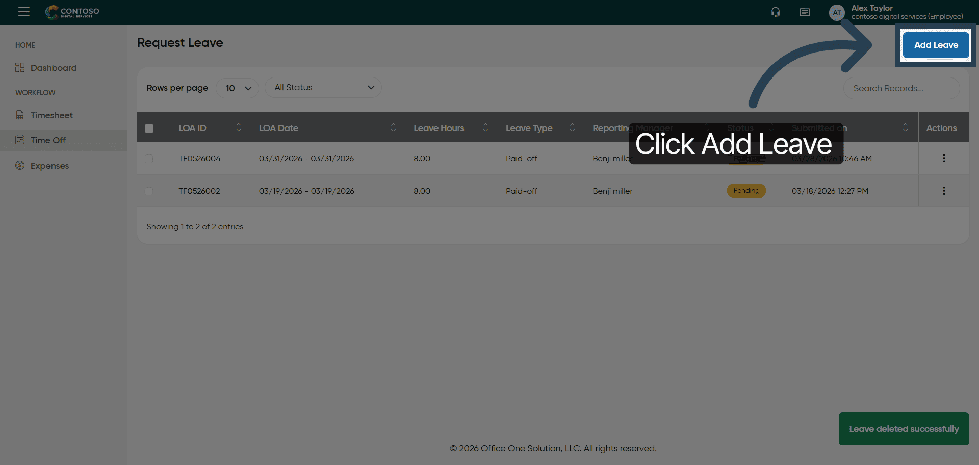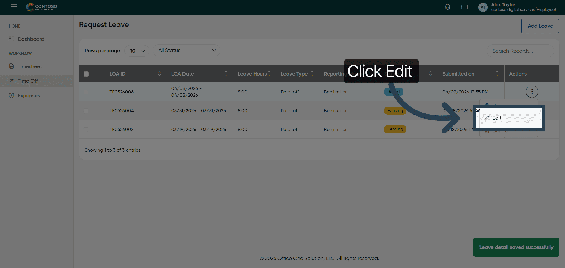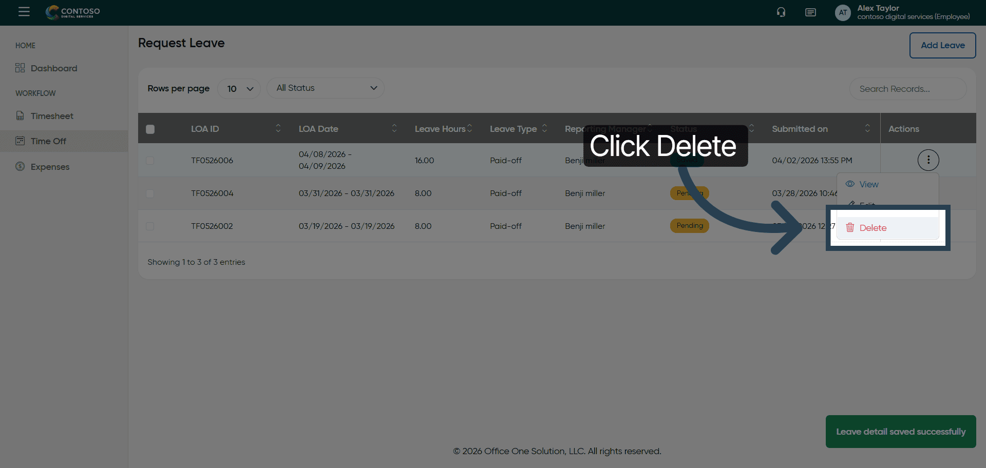 You have successfully managed leave requests by adding, editing, and deleting entries in OfficeOne Solution.