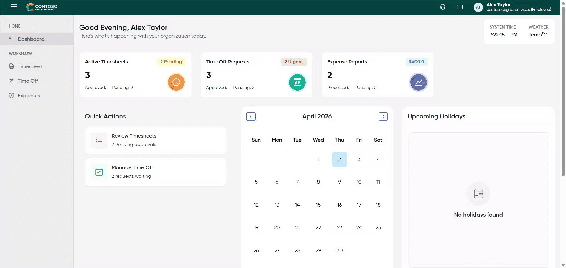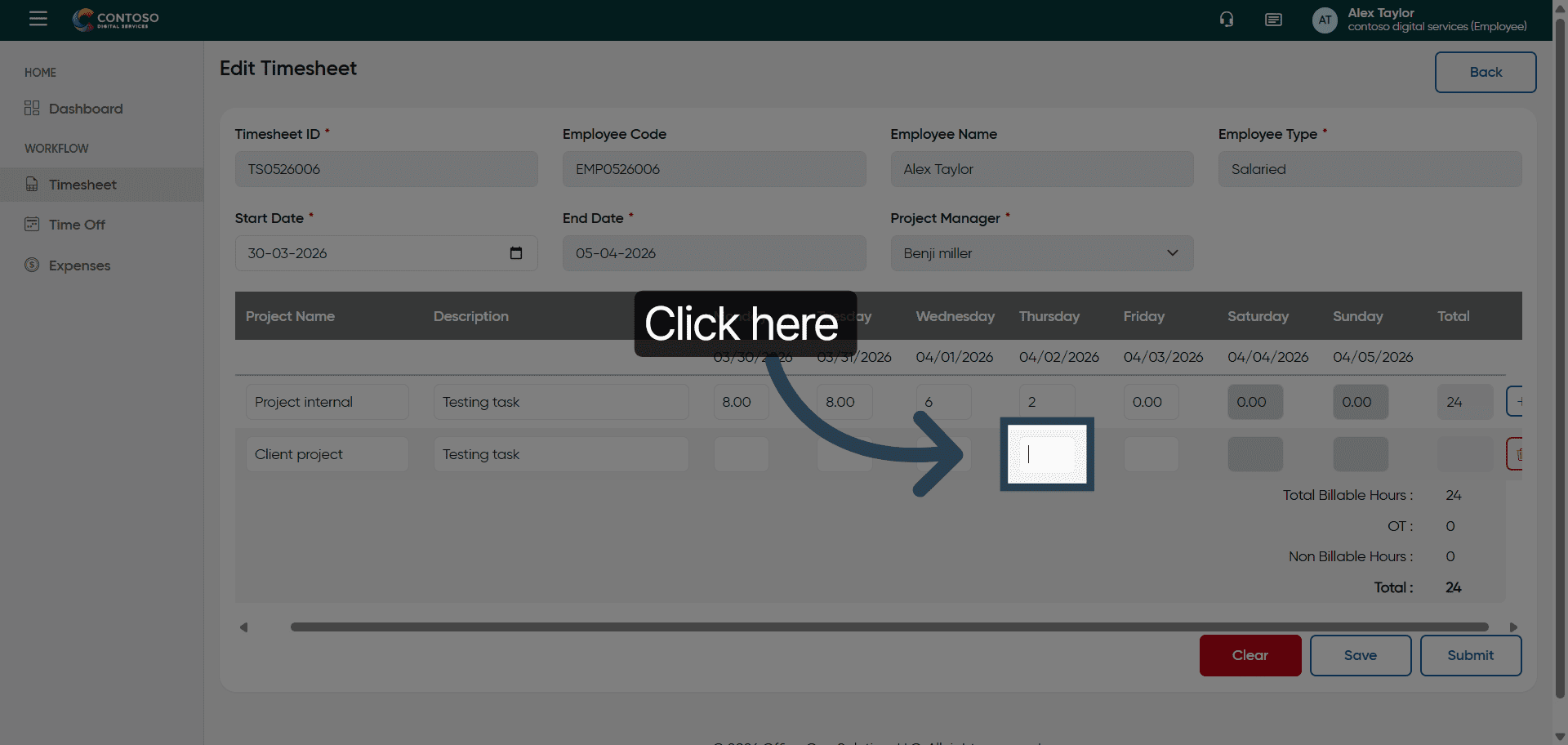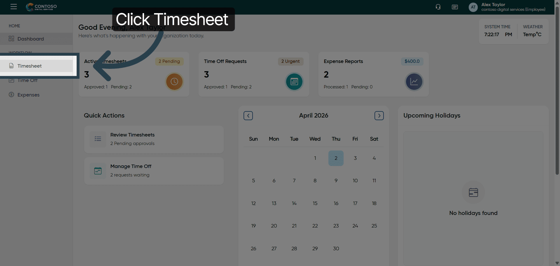 Click the Timesheet section to begin managing your work hours.