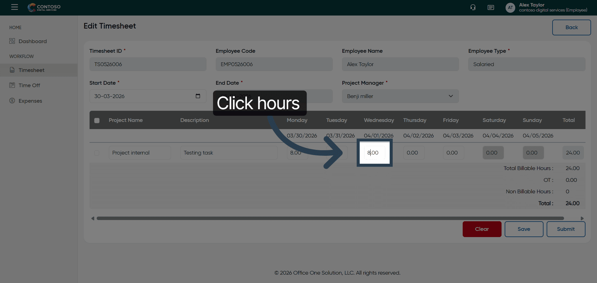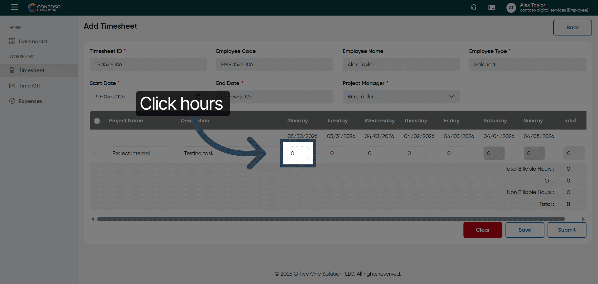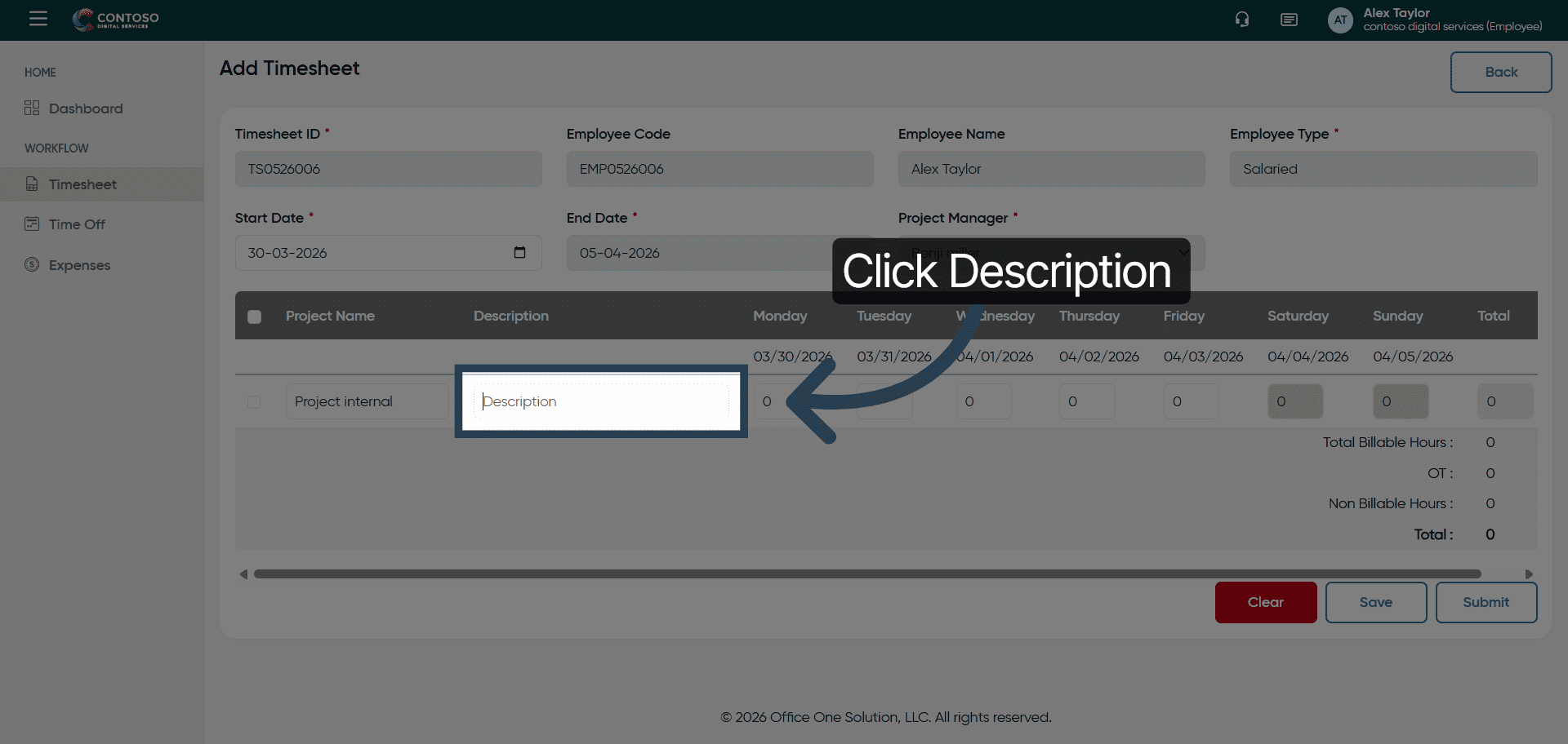This tutorial guides you through managing timesheets in OfficeOne