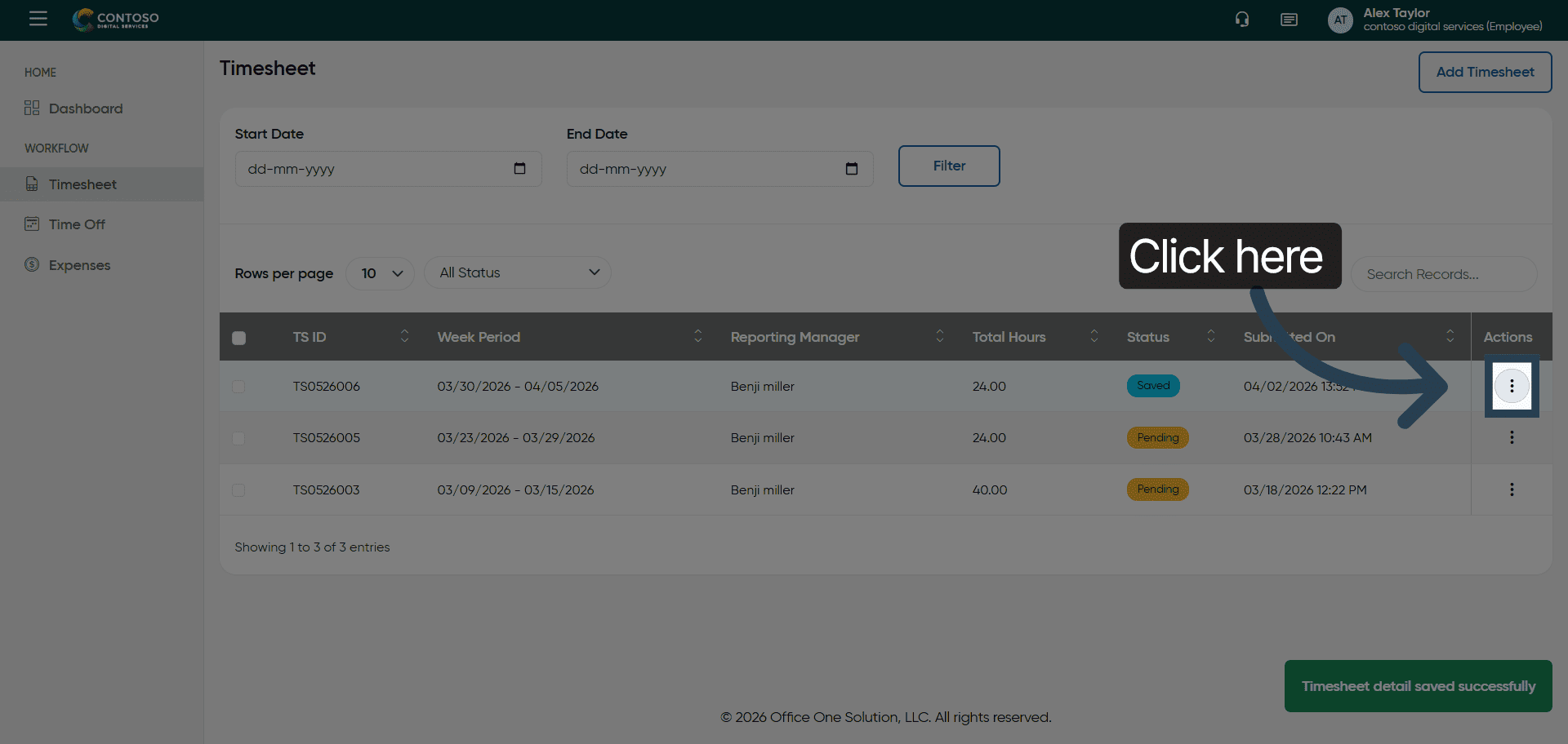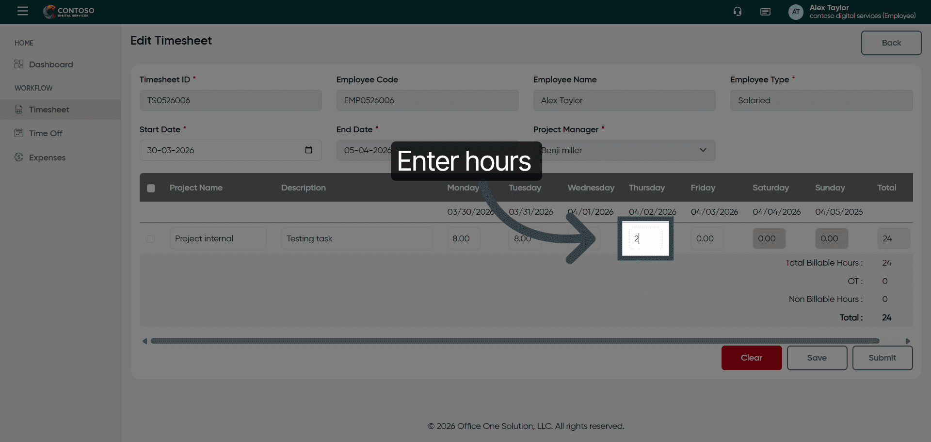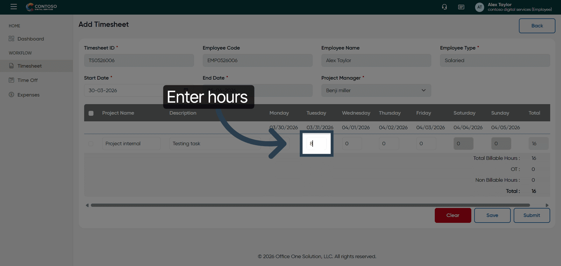 This tutorial guides you through managing timesheets in OfficeOne