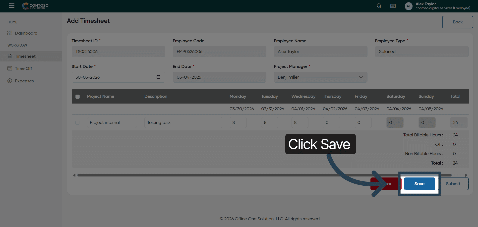 Click Save to store your new timesheet entry.