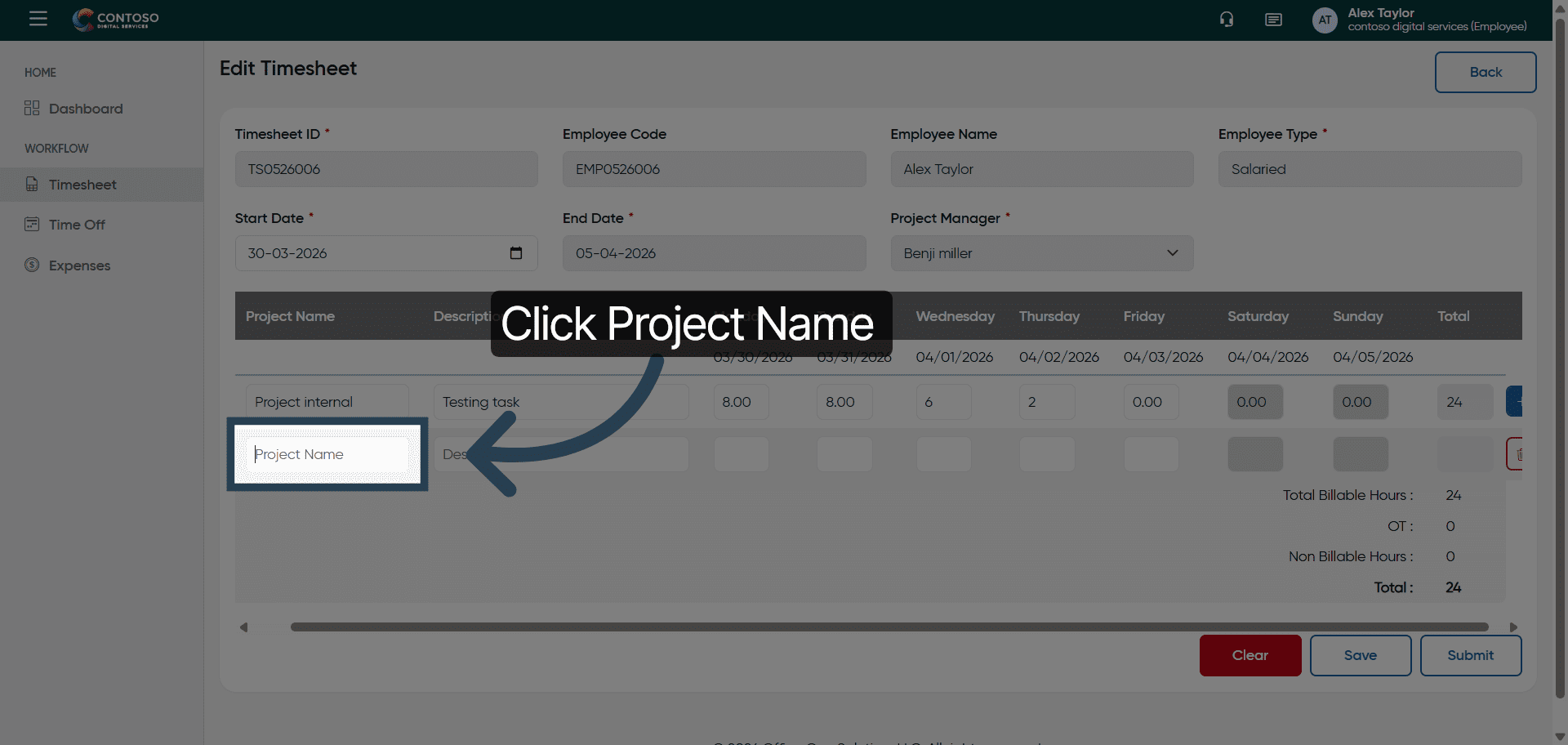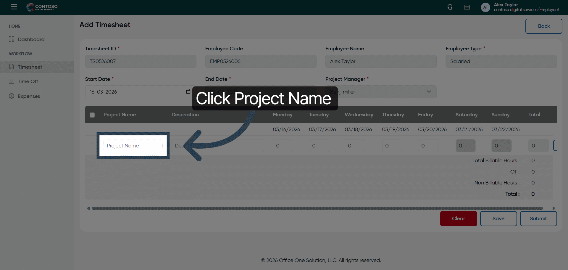 Click the Project Name field and enter the details to specify the project for your timesheet.