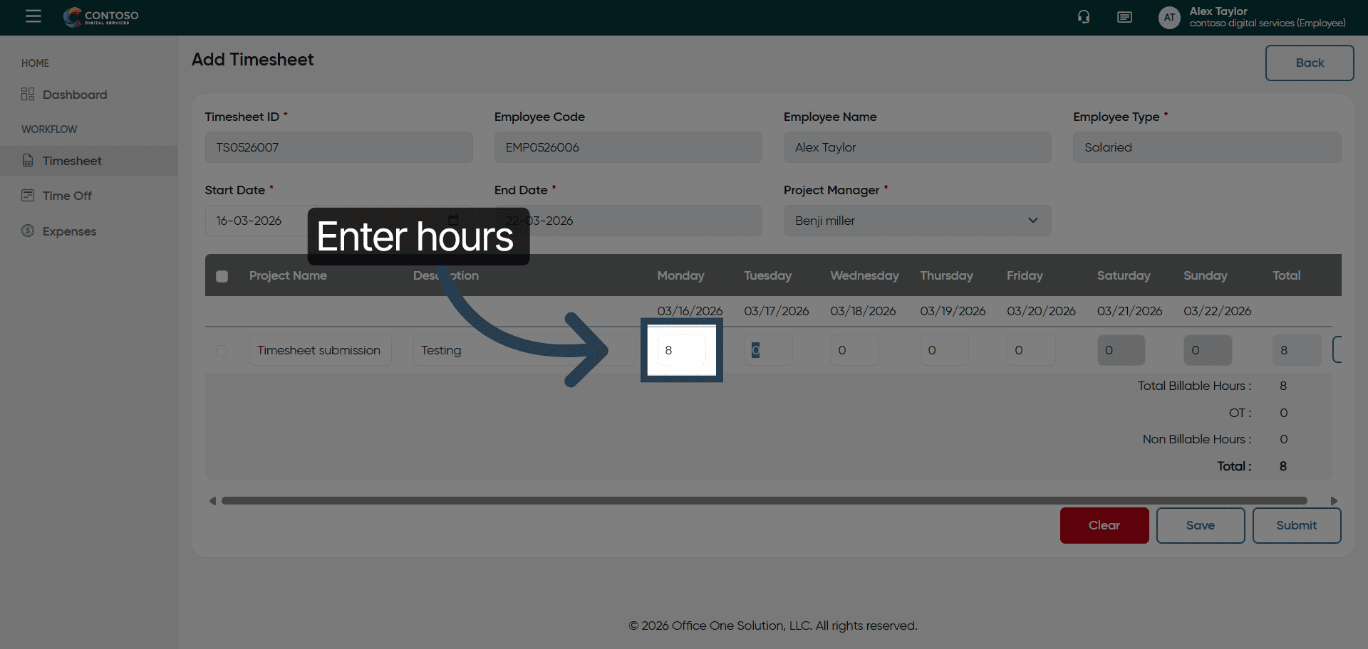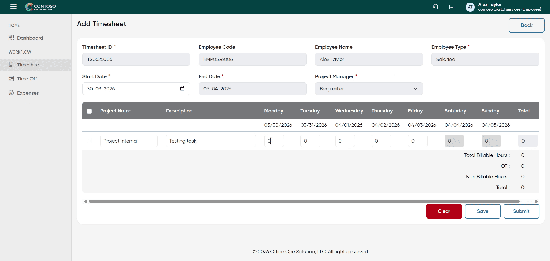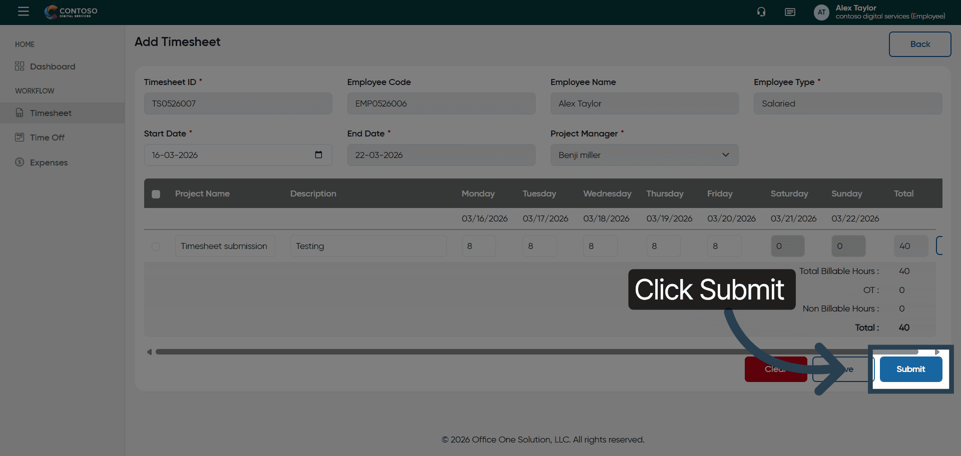 You have successfully managed your timesheets by adding, editing, deleting, and submitting entries in OfficeO Solution. Continue tracking your work hours regularly to maintain accurate records and streamline your reporting process.