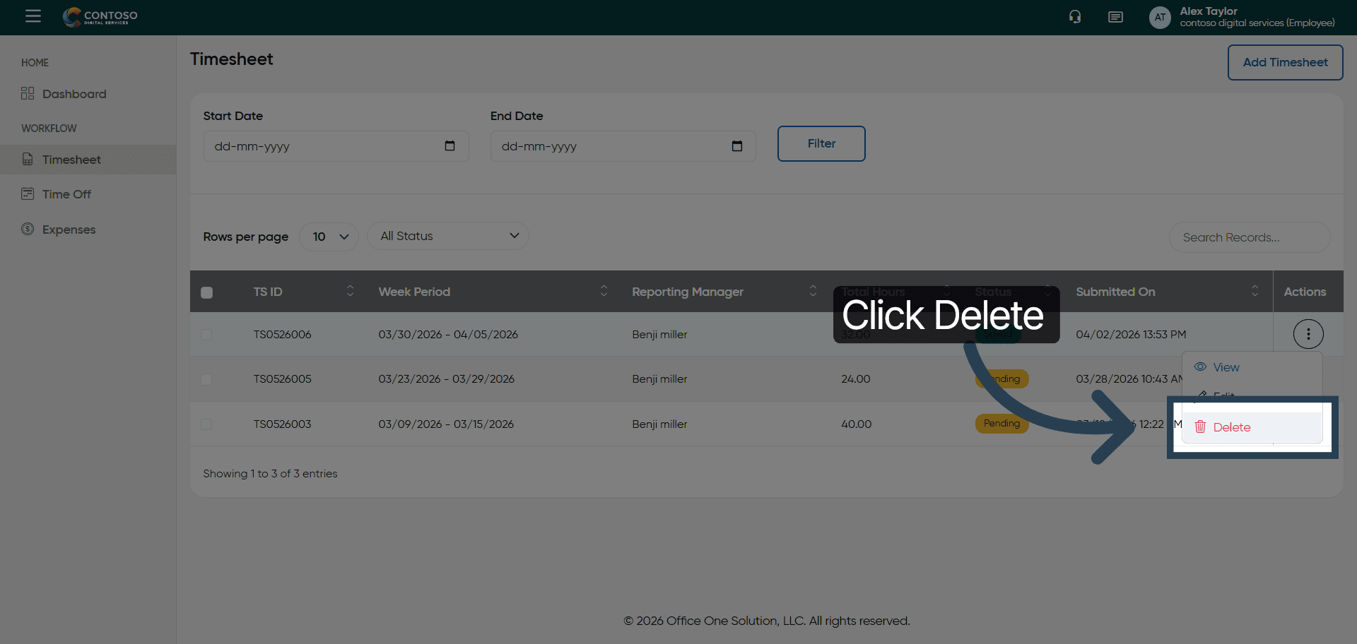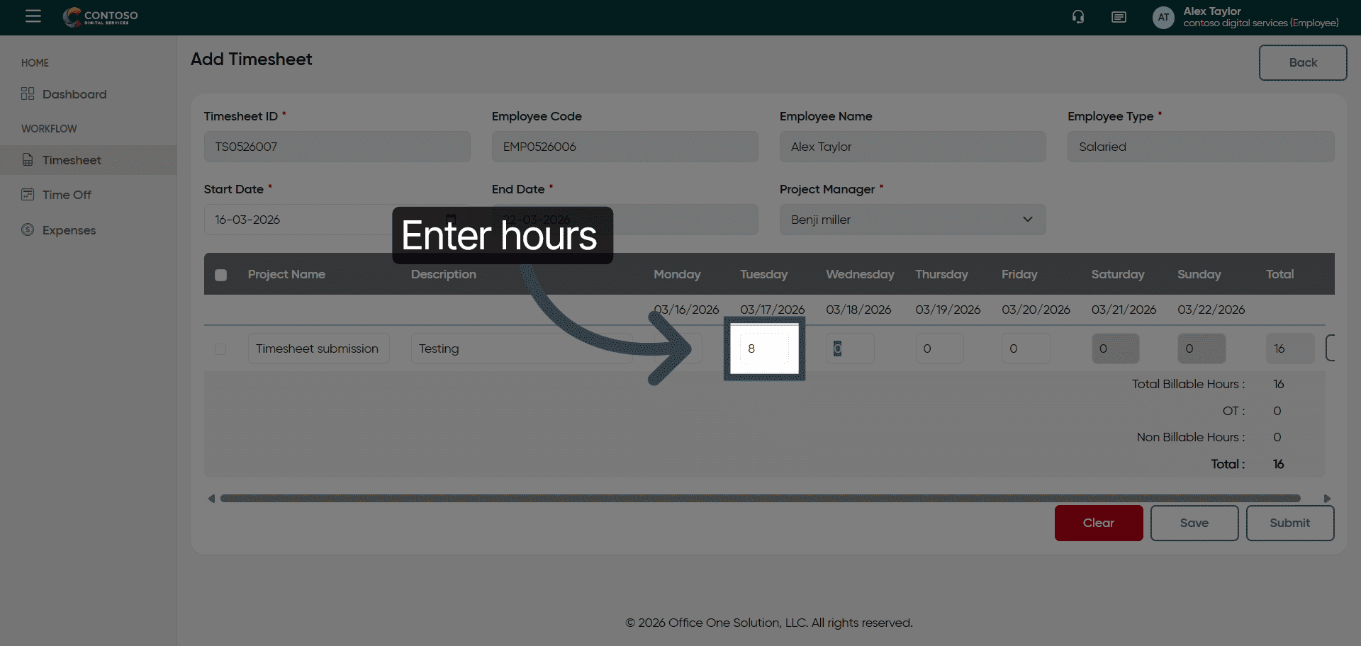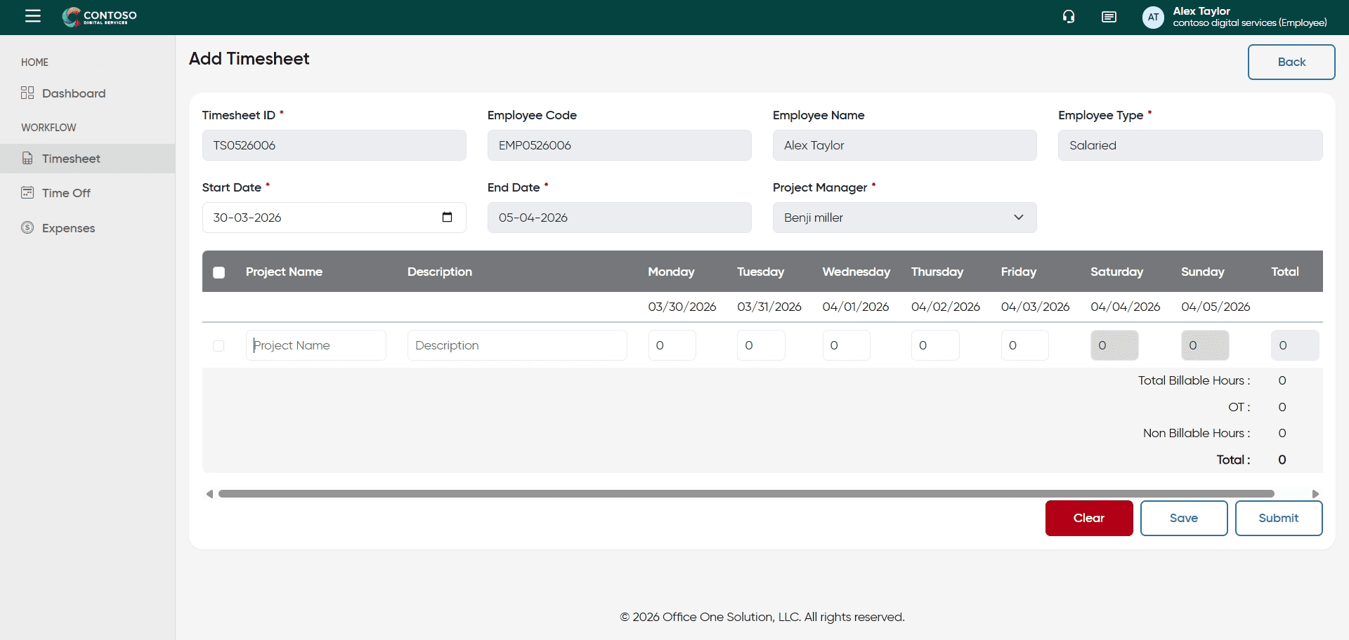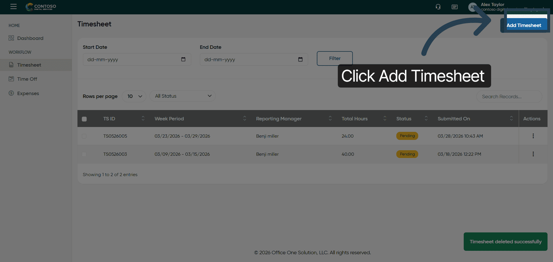 You have successfully managed your timesheets by adding, editing, deleting, and submitting entries in OfficeO Solution. Continue tracking your work hours regularly to maintain accurate records and streamline your reporting process.