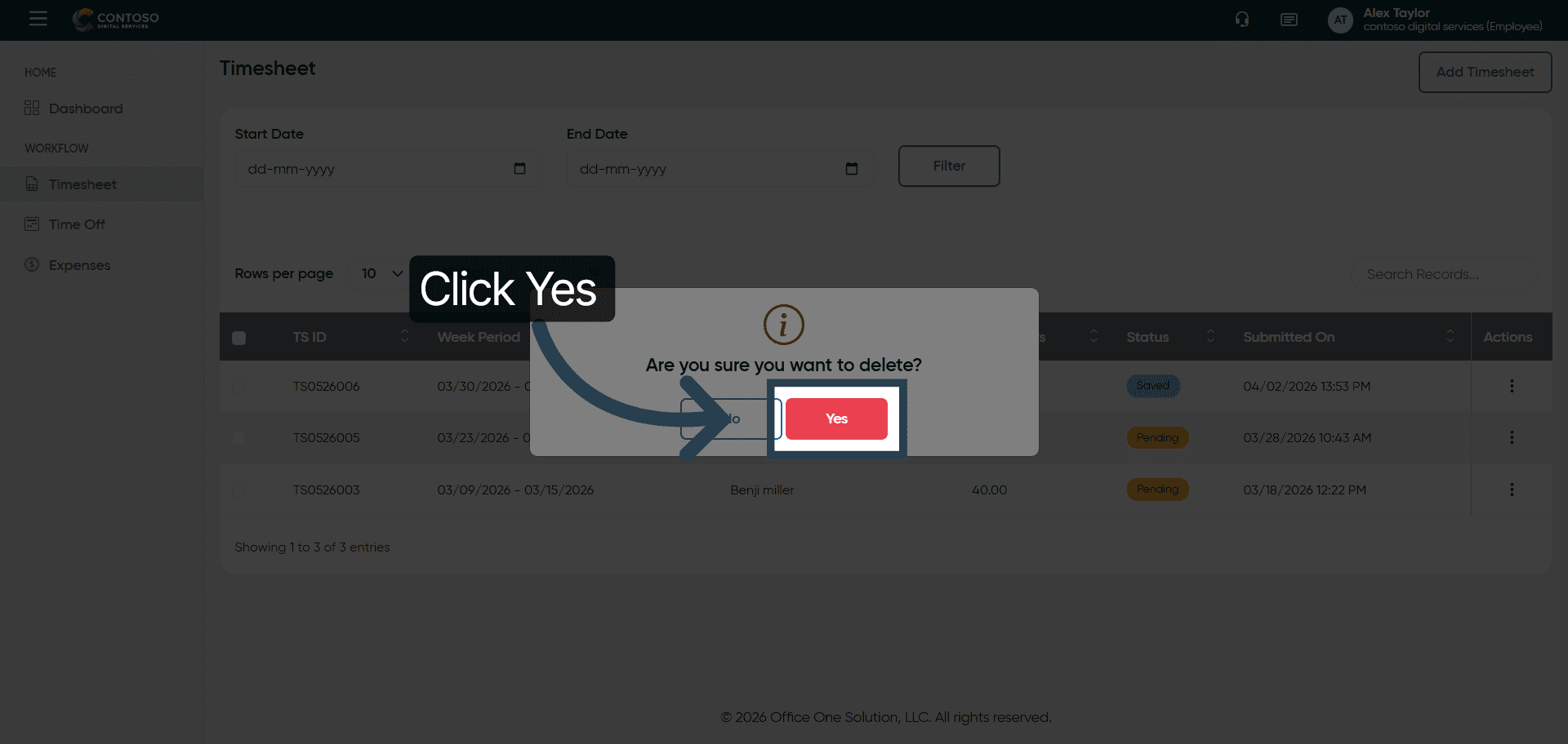 Click Yes to confirm and permanently delete the timesheet entry.