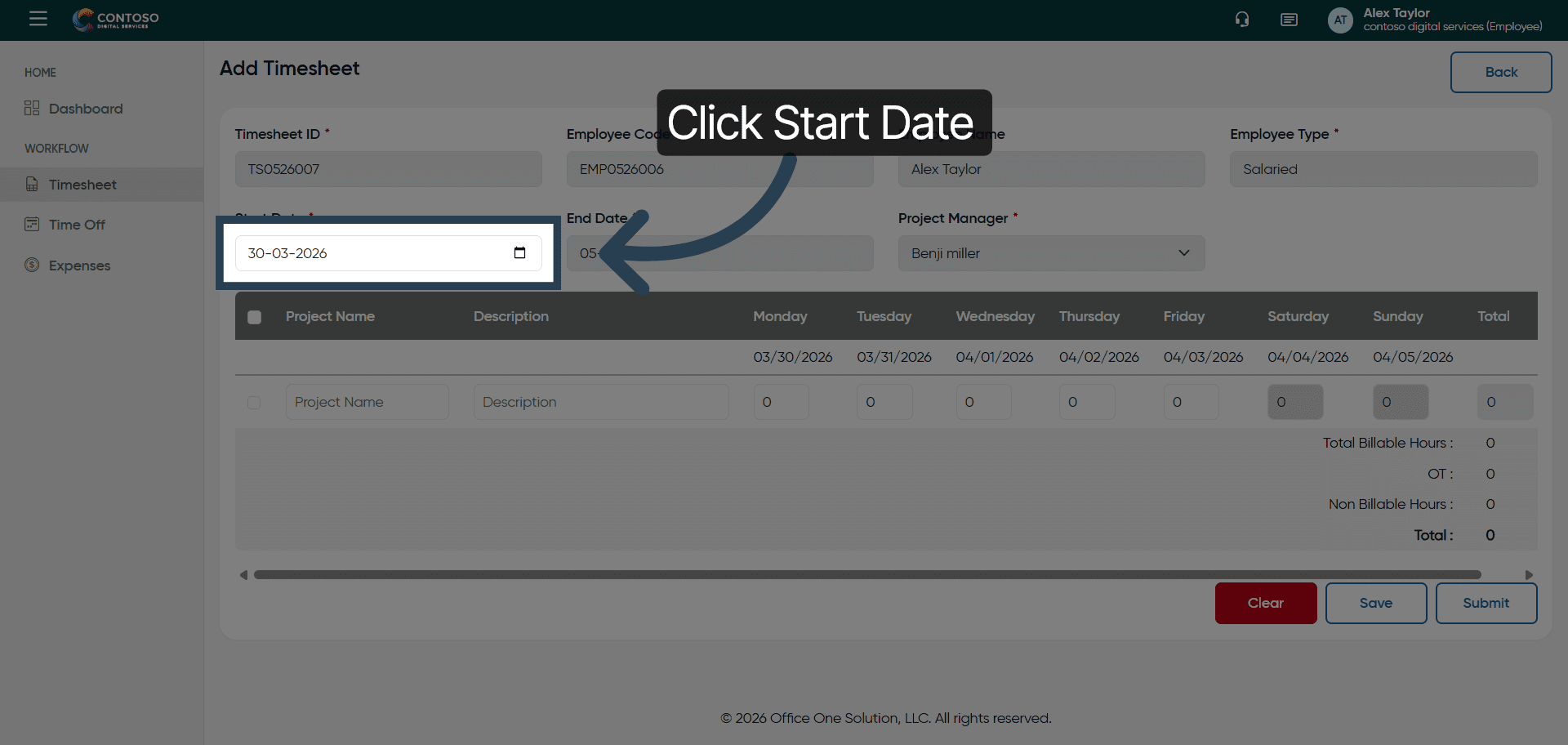 Click and fill the Start Date field to specify the beginning date of your timesheet.