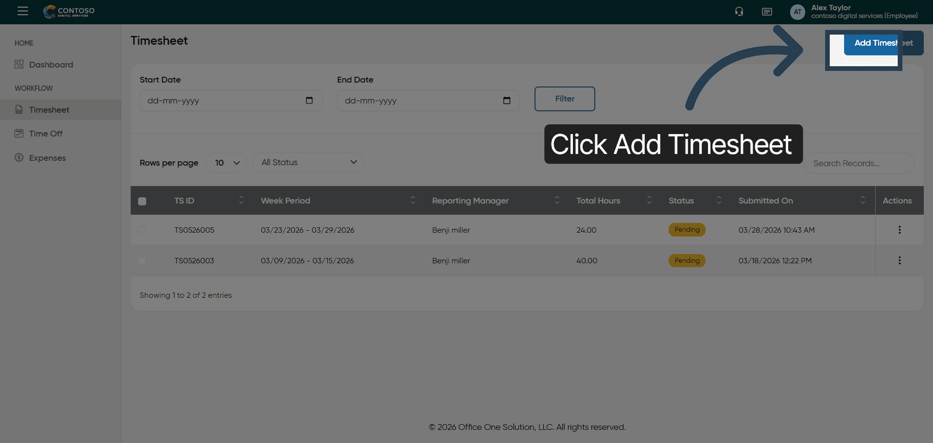 Click Add Timesheet to create a new timesheet entry.