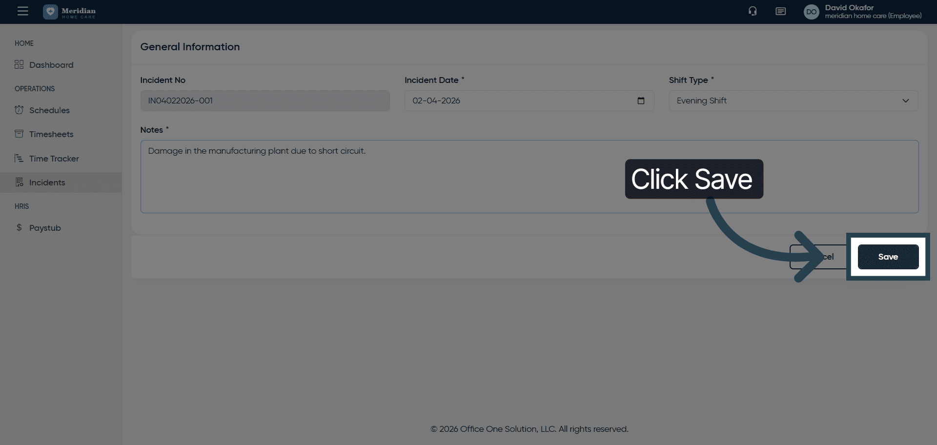 Click “Save” to store the new incident information.