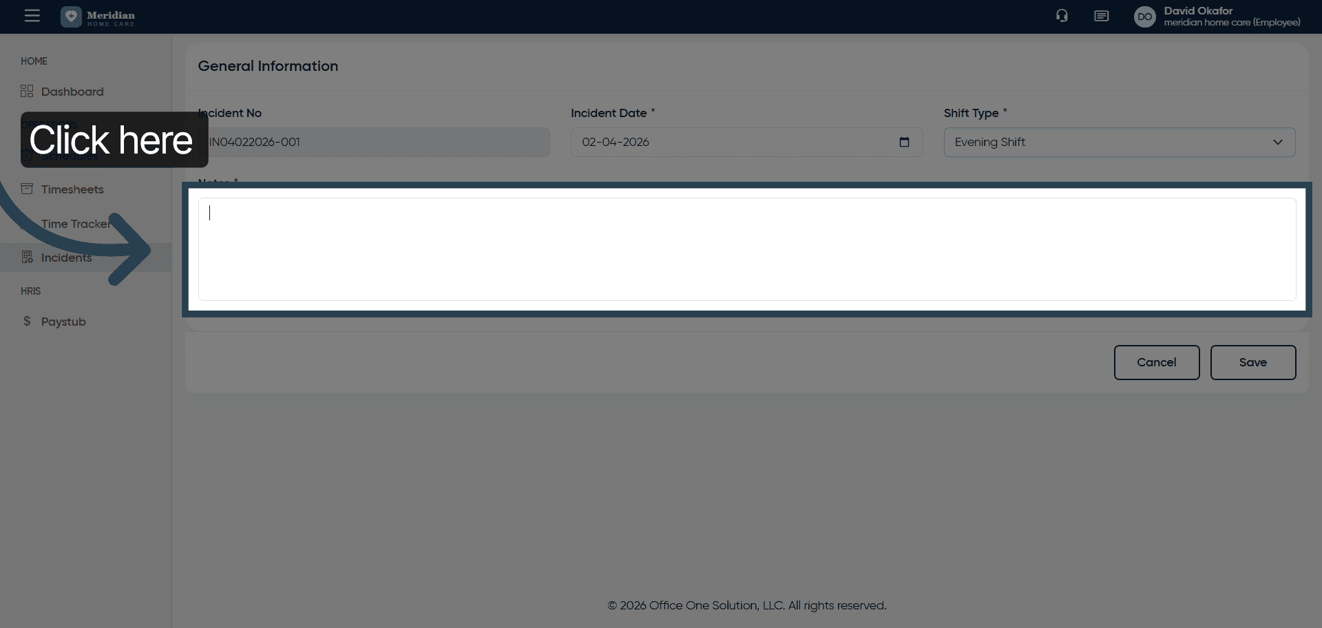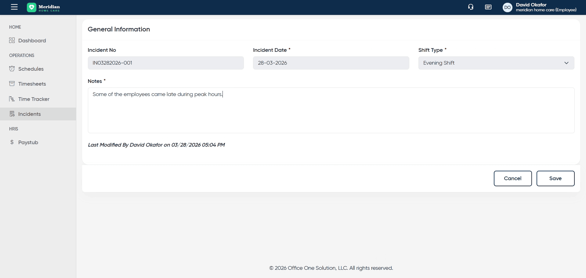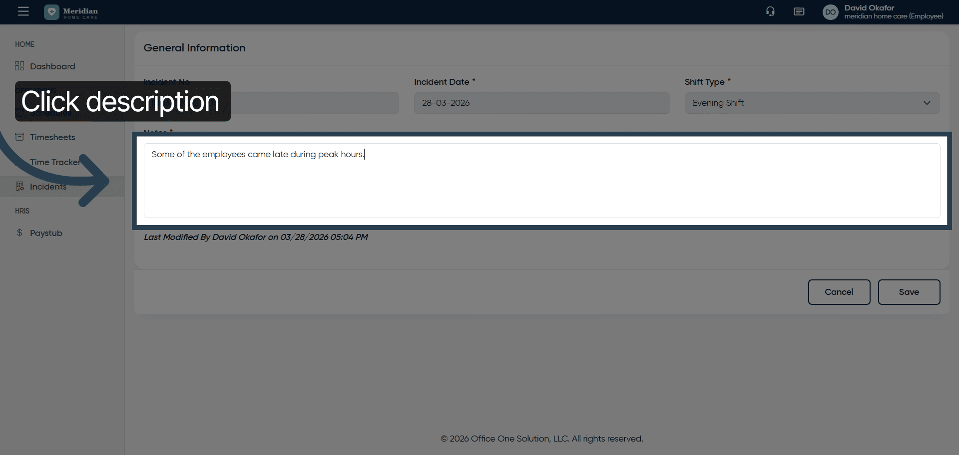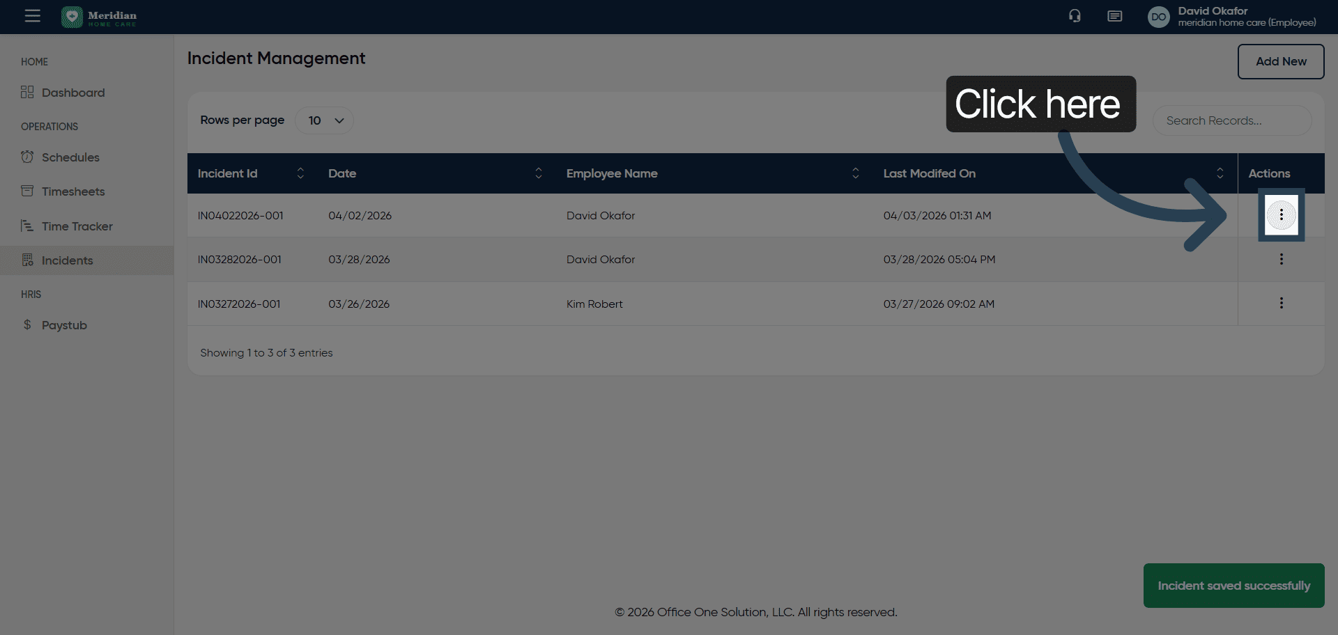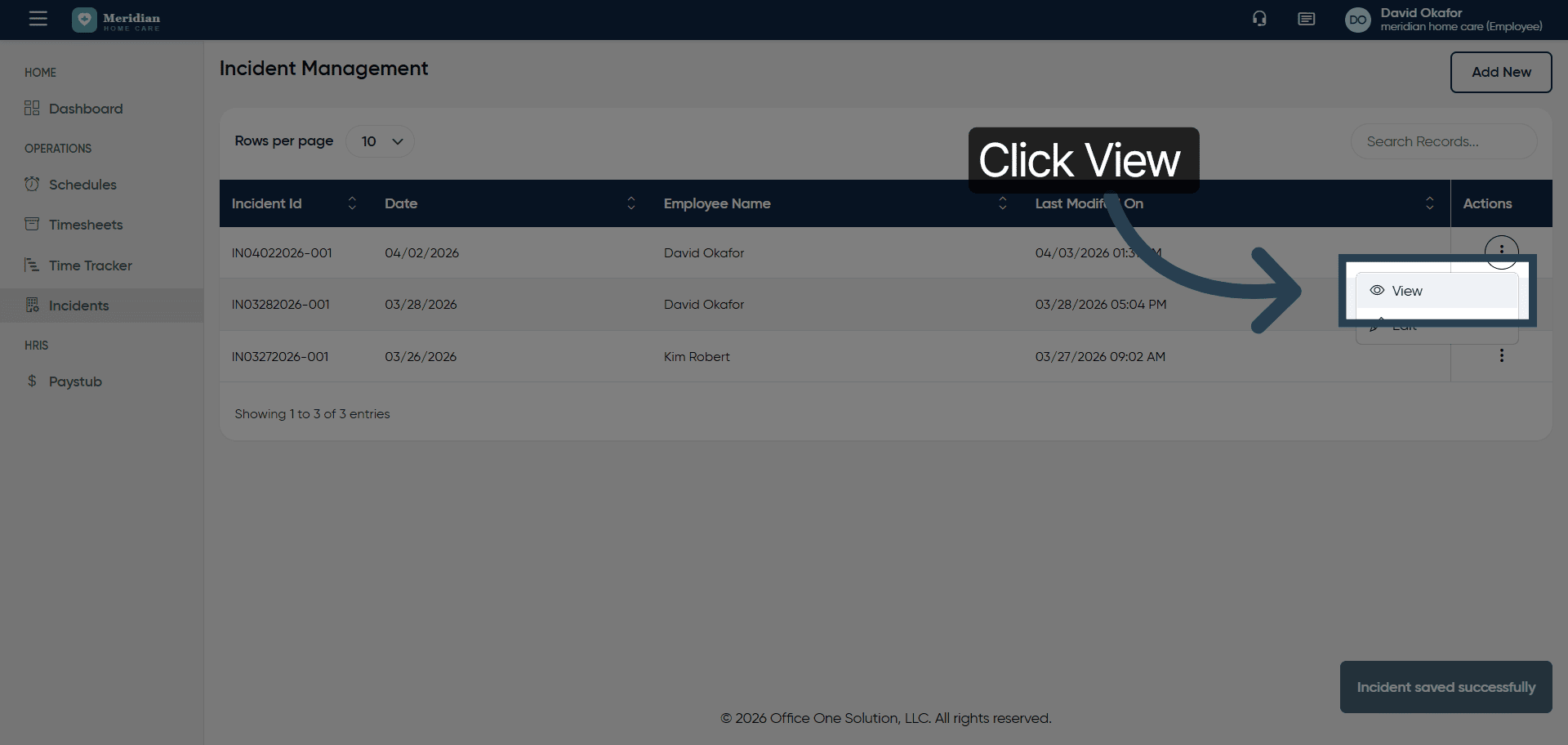 You have successfully managed incident records by adding new entries, viewing details, editing descriptions, and saving updates in OfficeOne.