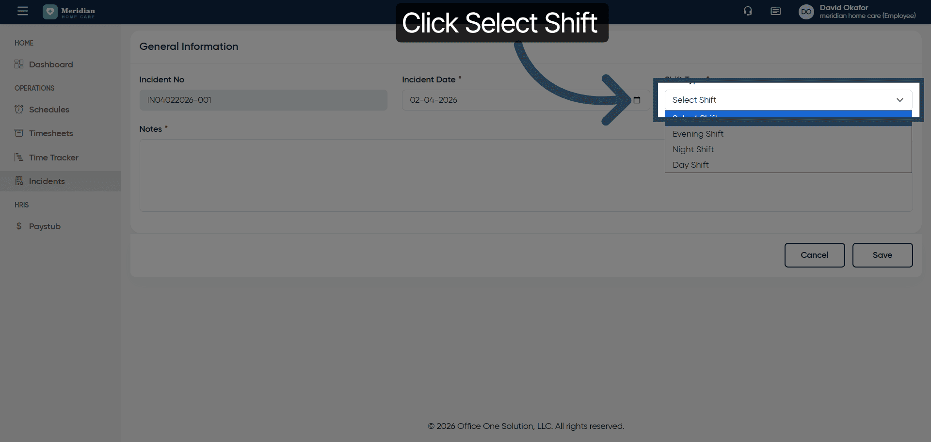 Click “Select Shift” to choose the relevant work shift for the incident.