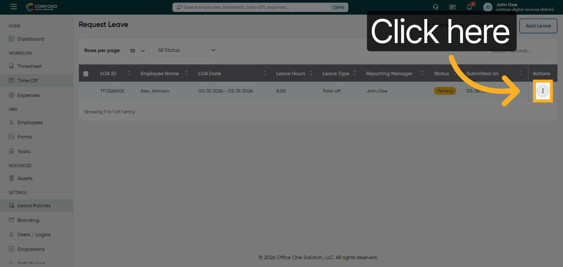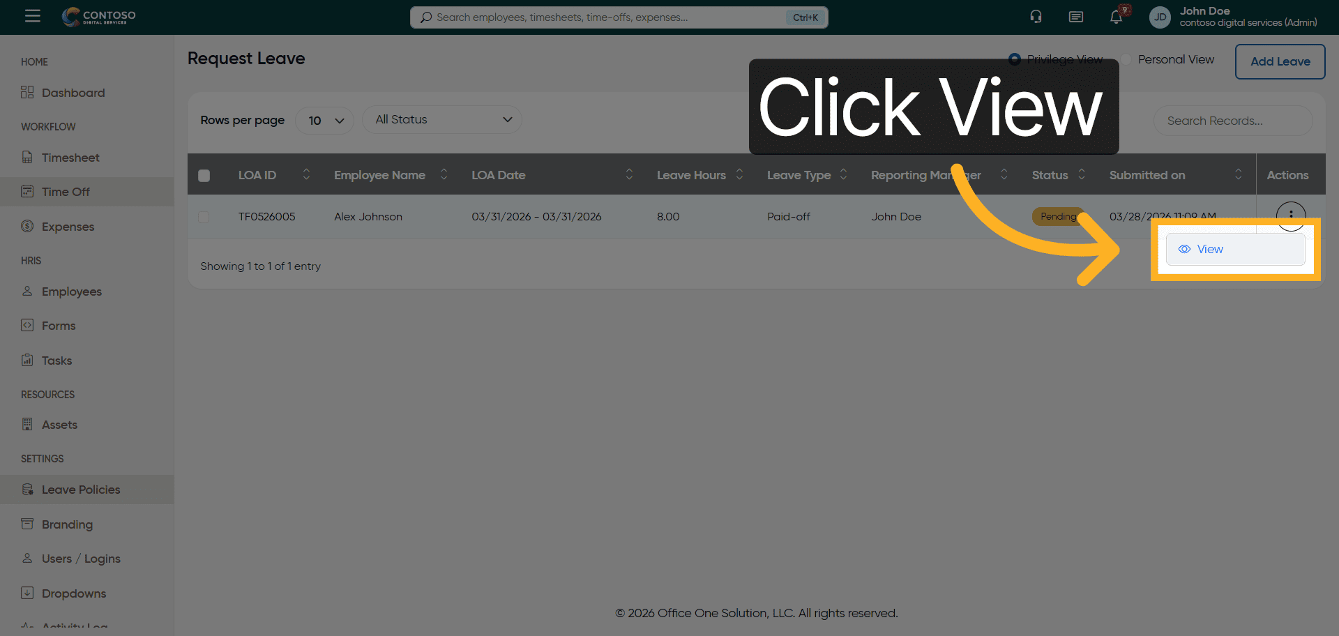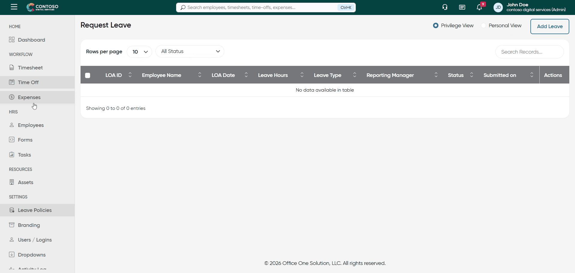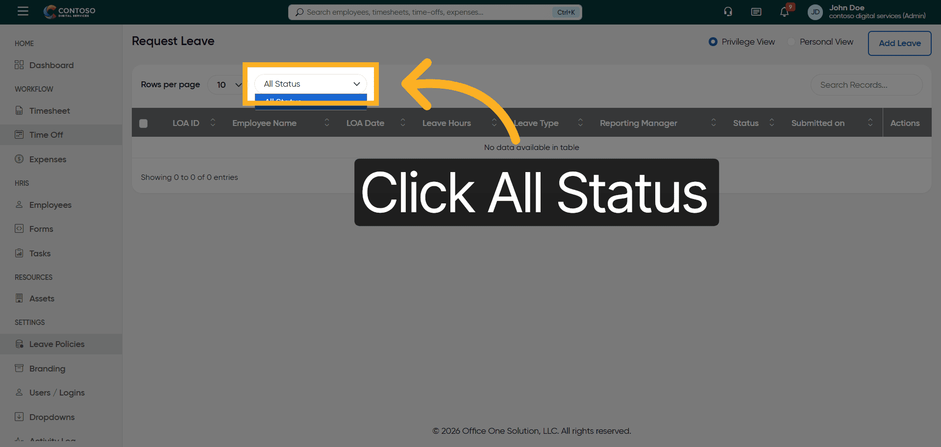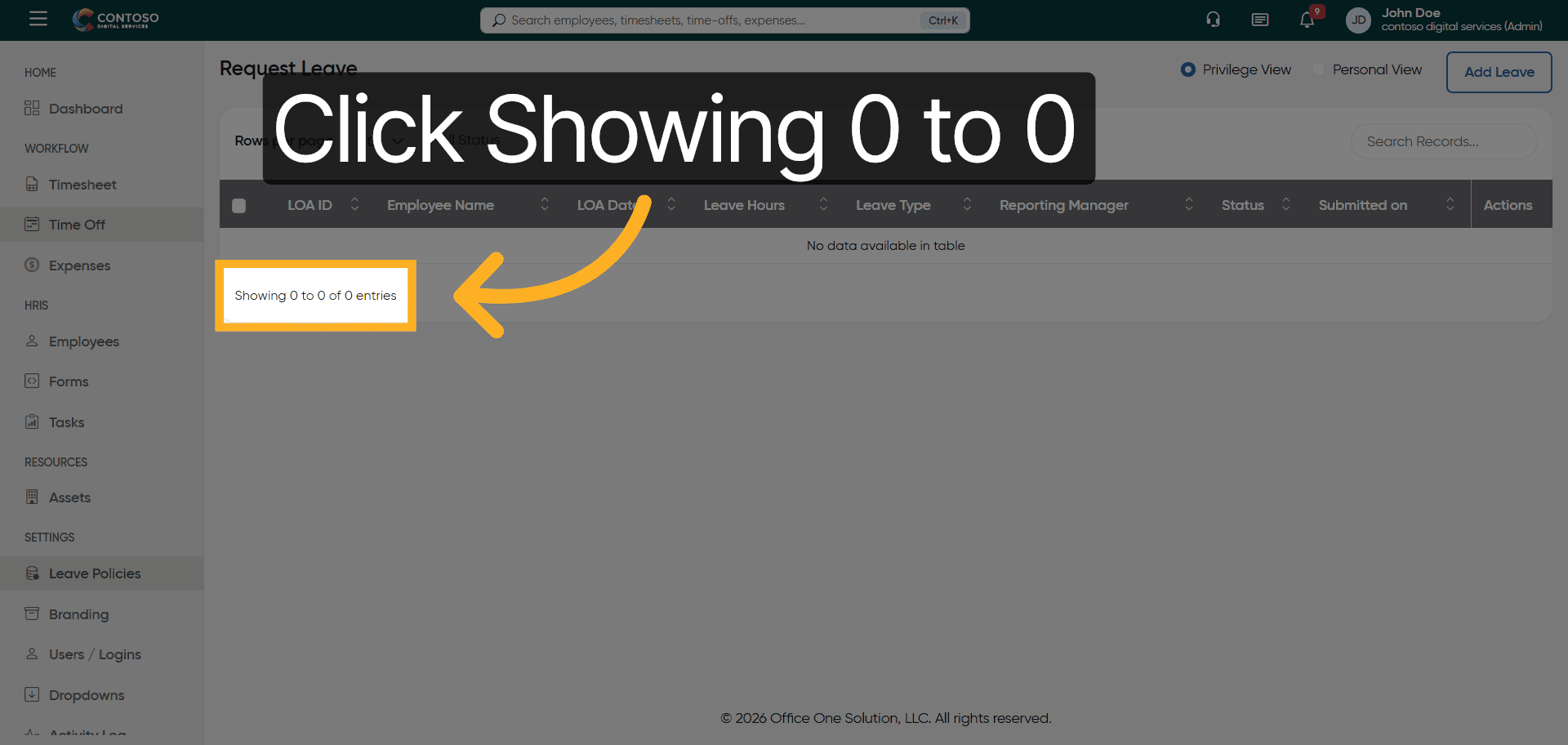 Click the Showing 0 to 0 of 0 entries area to view the list of leave requests available.