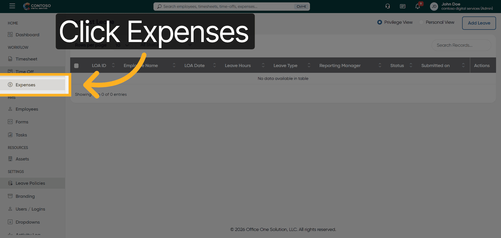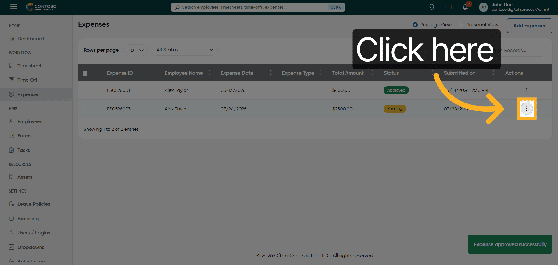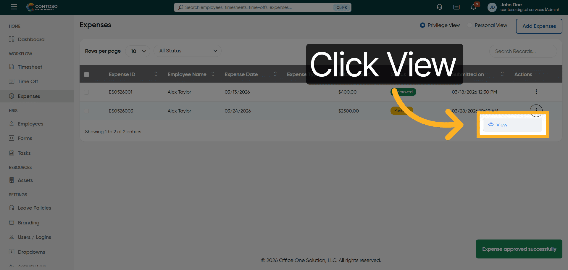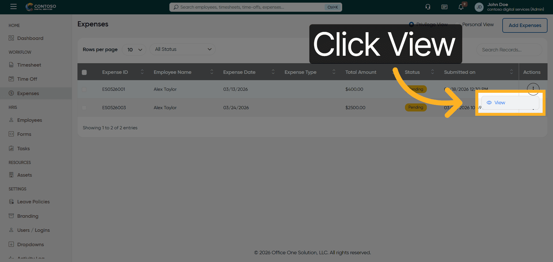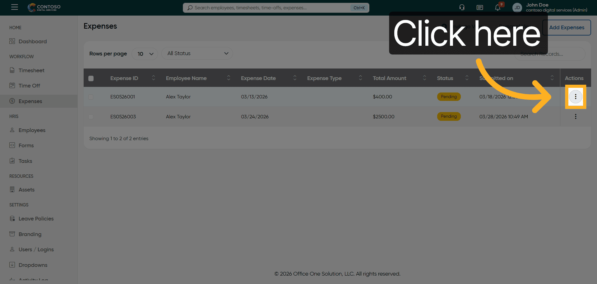 Click the Expenses tab to manage and review expense reports submitted by employees.