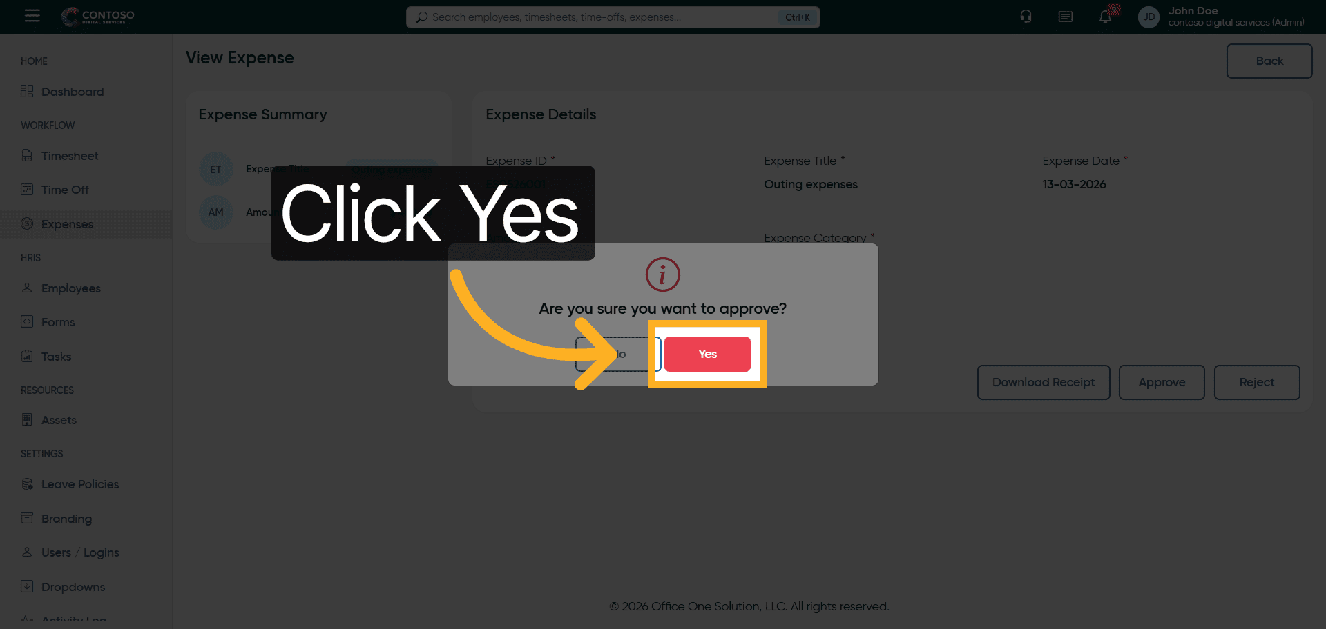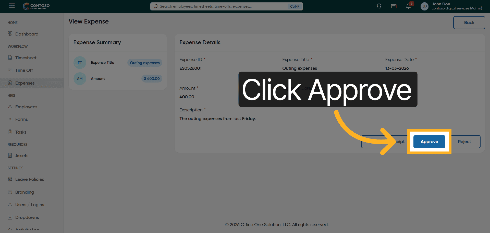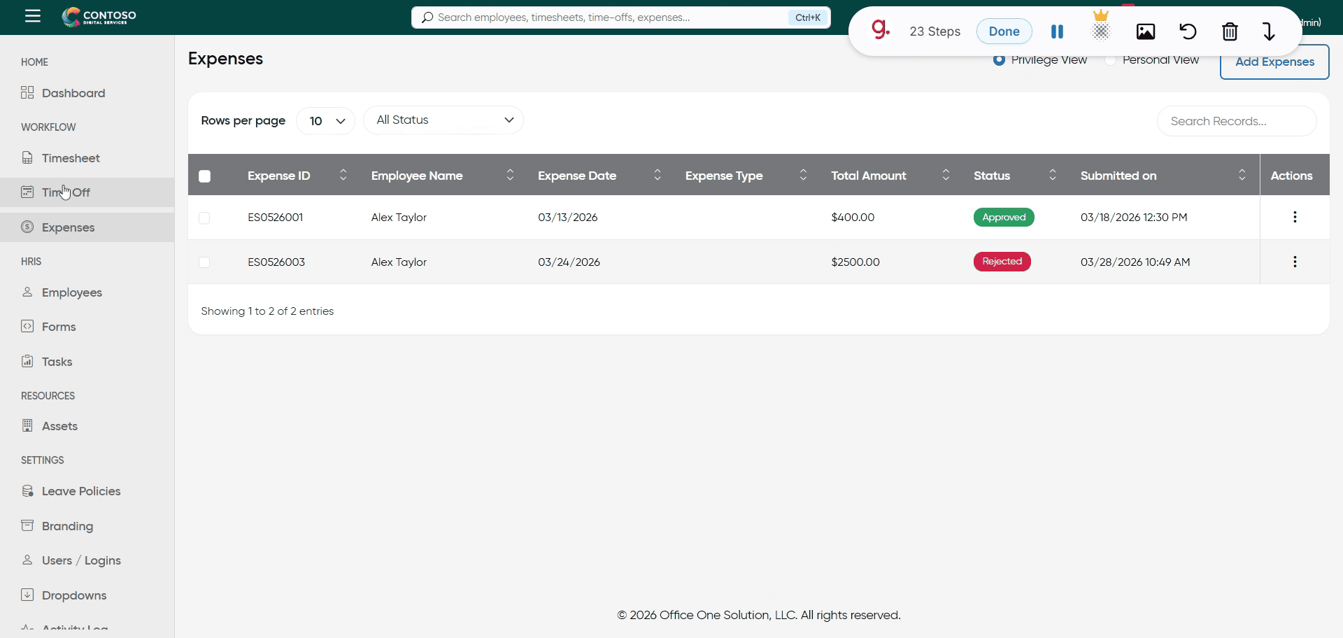 After completing this training, you will be able to efficiently manage timesheets, leave requests, and expense approvals within Office1solution. Practice these steps regularly to ensure accurate processing and compliance with company policies.