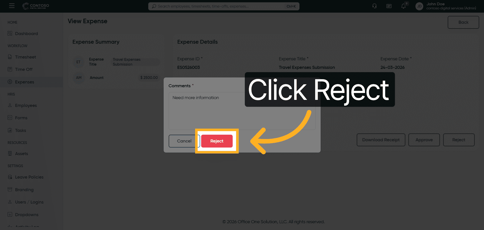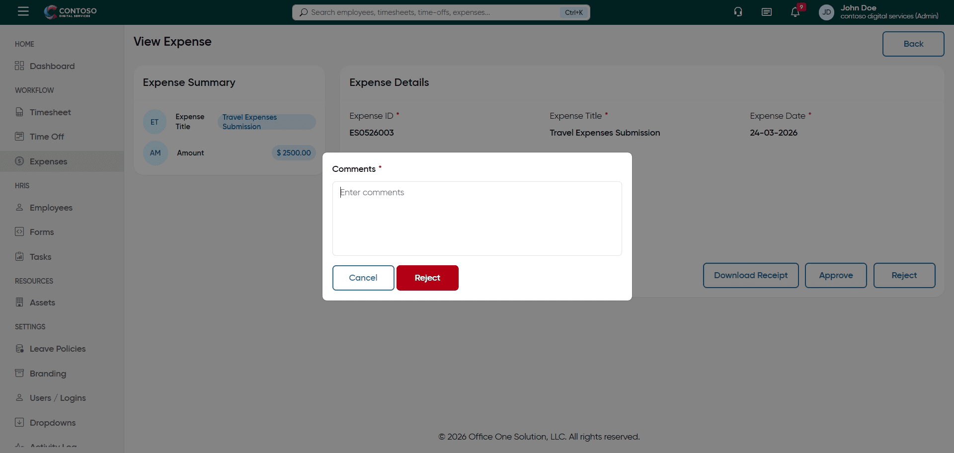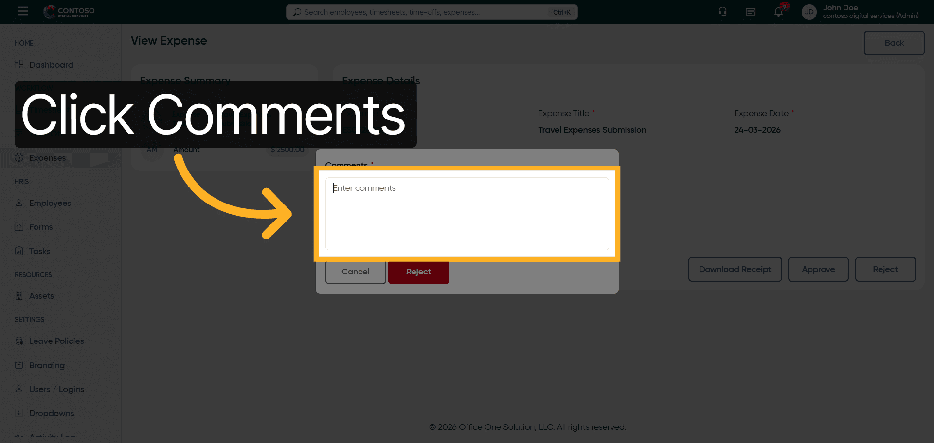 Click the Comments section to provide feedback or reasons for rejecting the expense report.