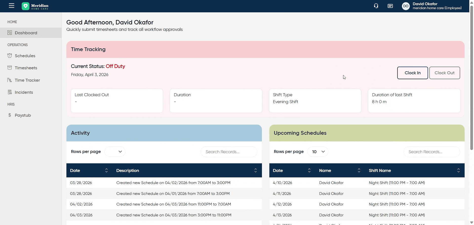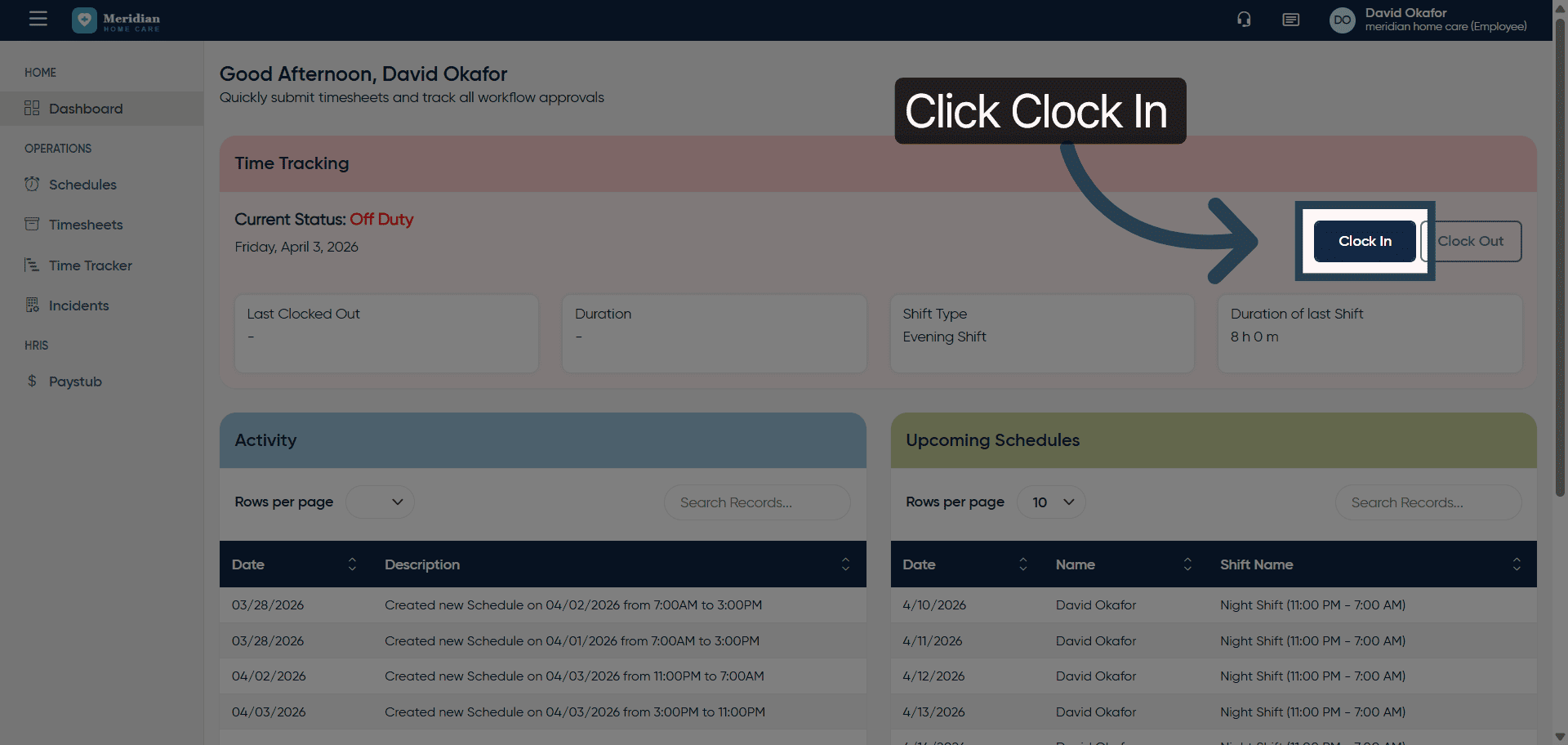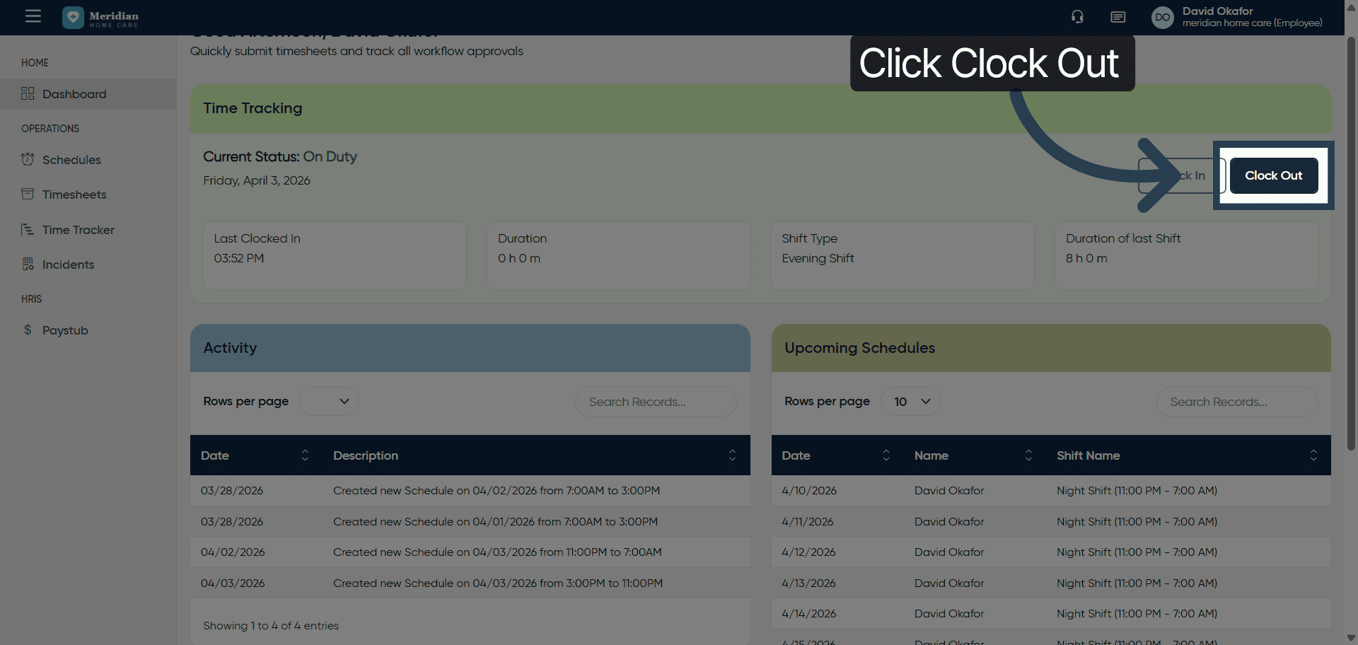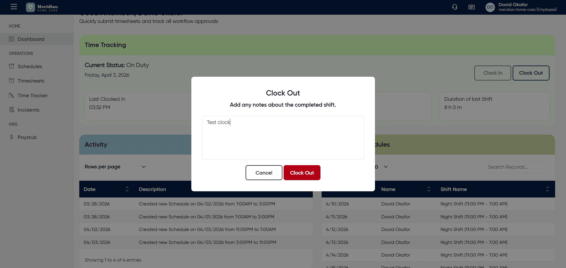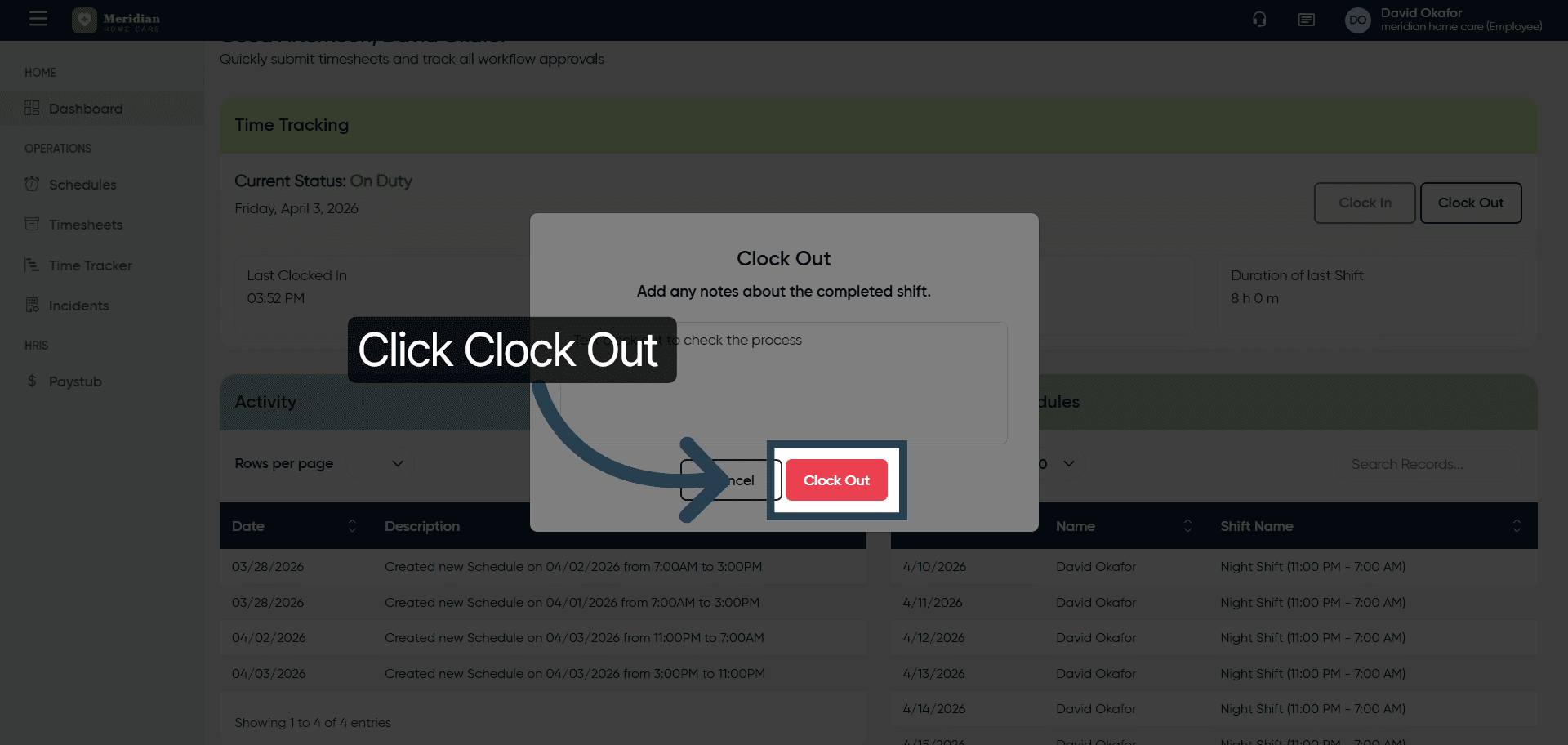 Lets check the clock out process. Click “Clock Out” when you are ready to end your work session for the day.