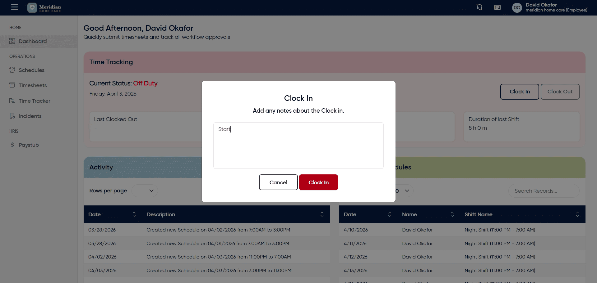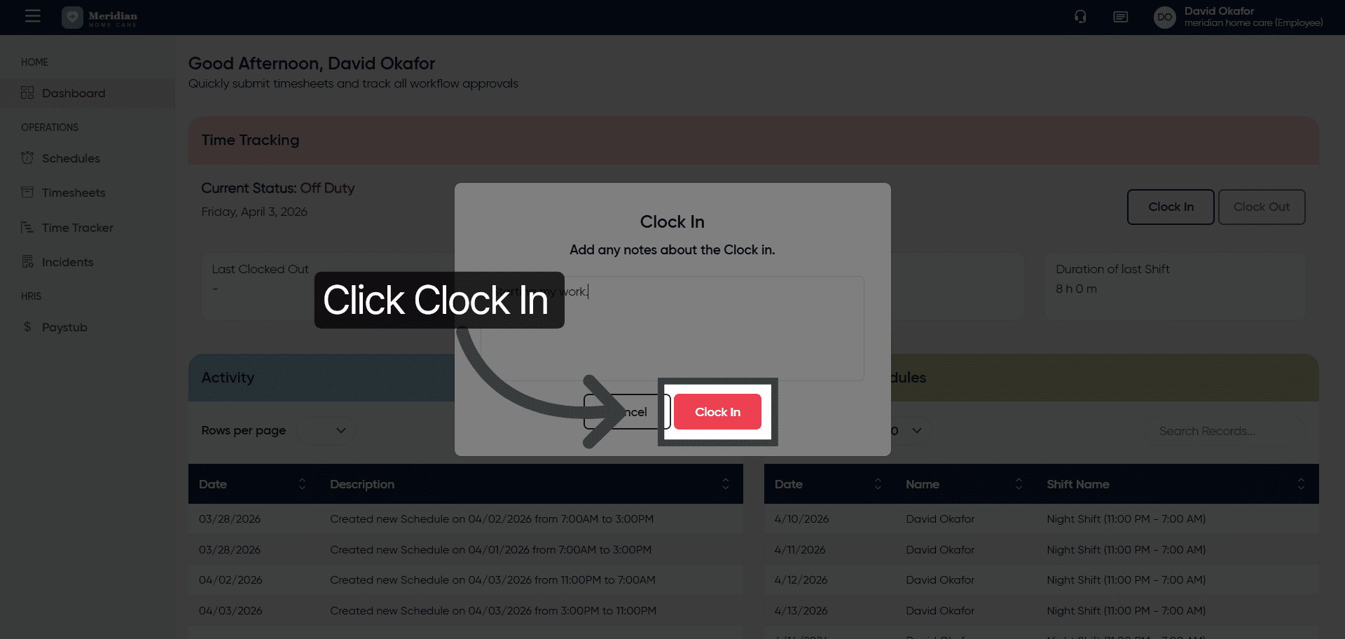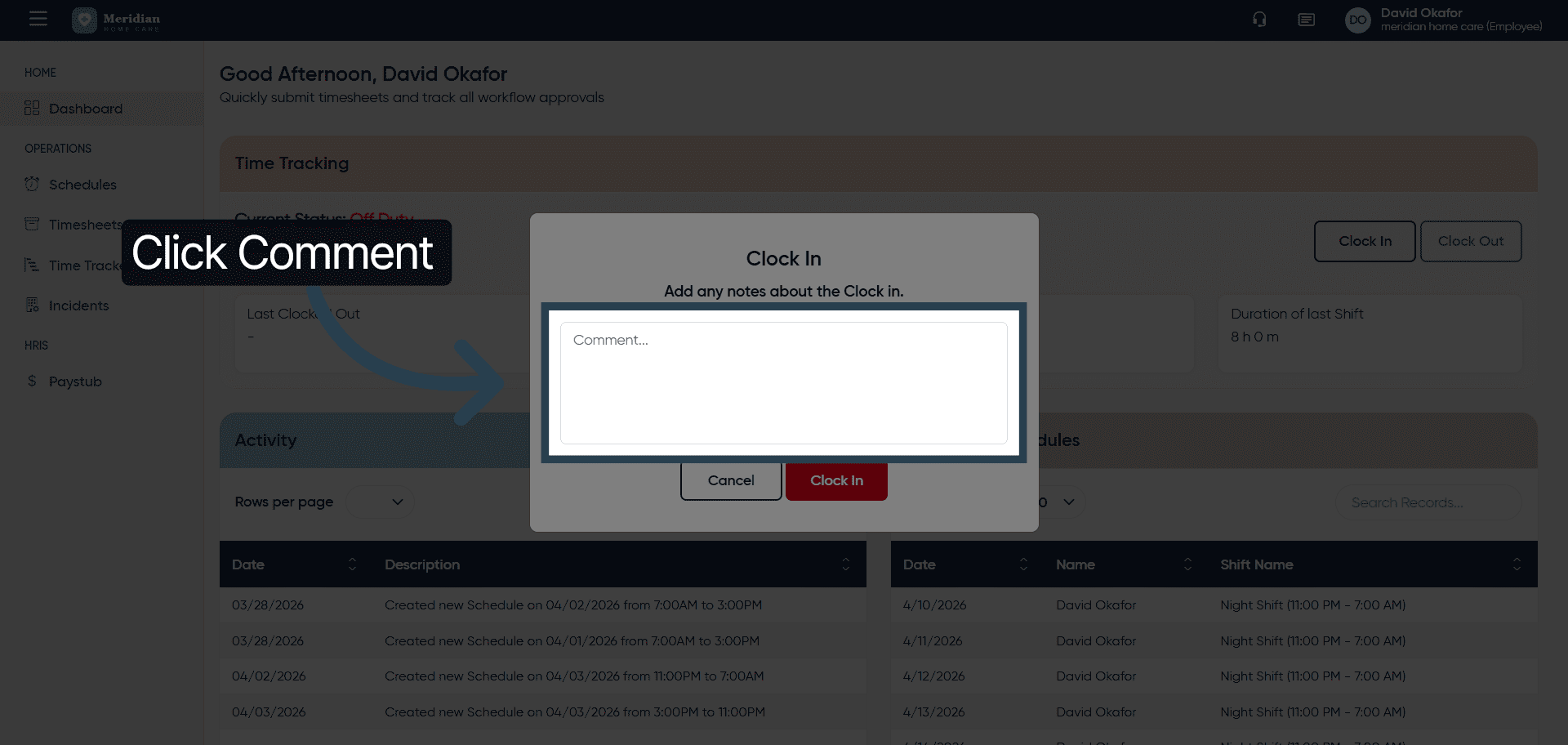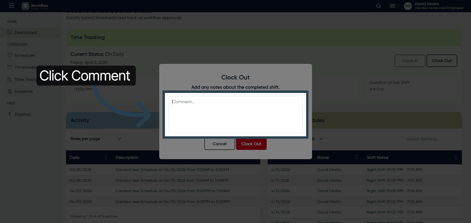 You will learn to clock in and out while adding relevant comments to document your work status.