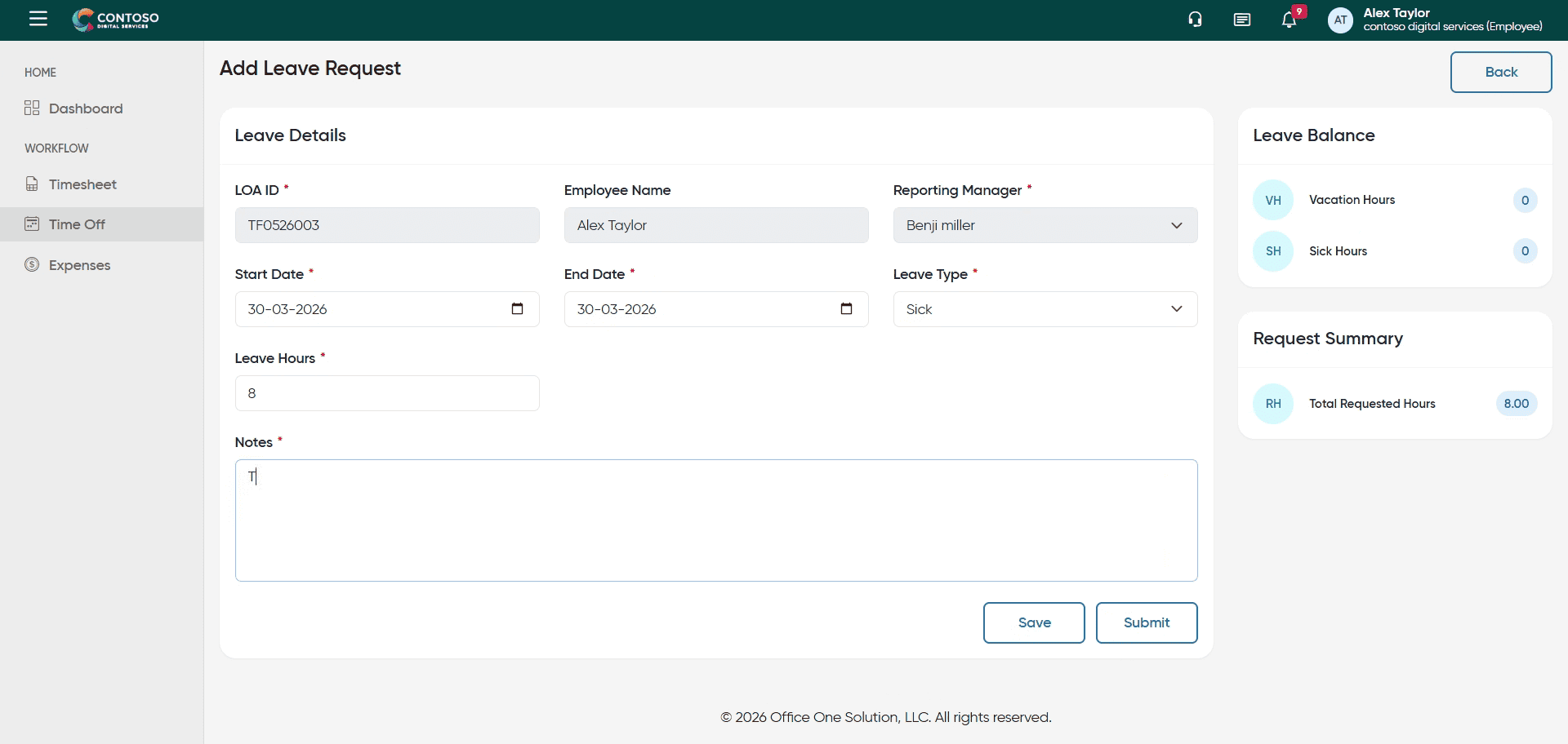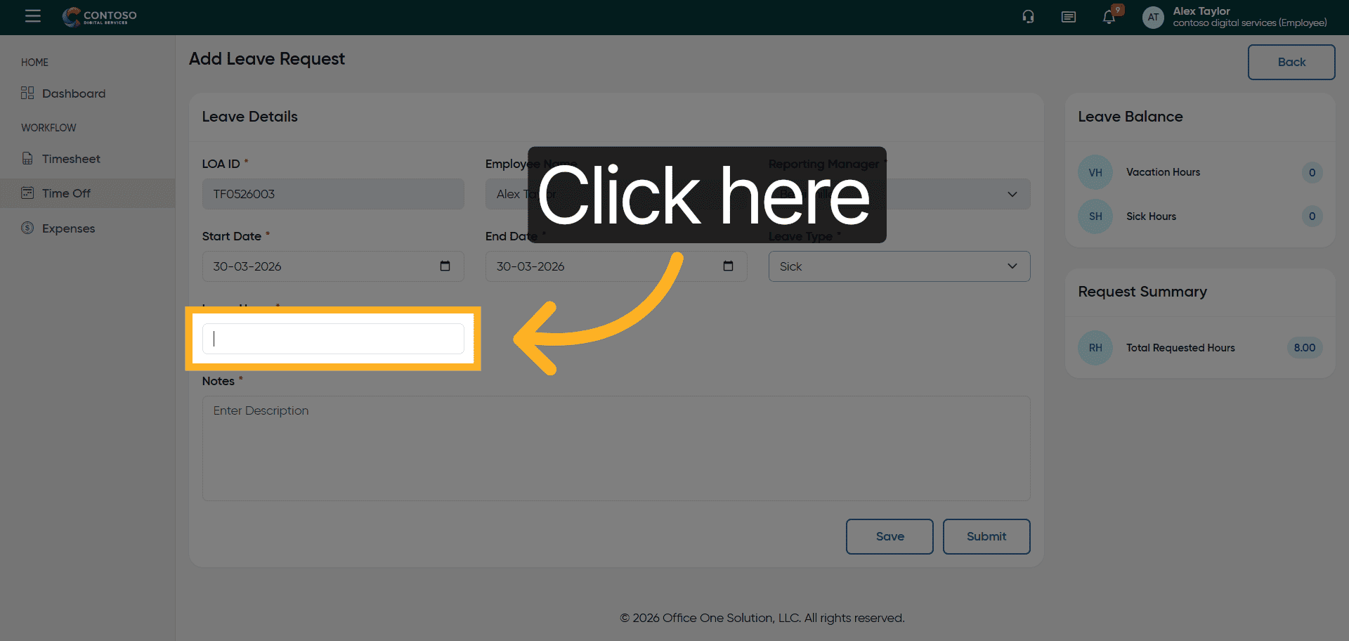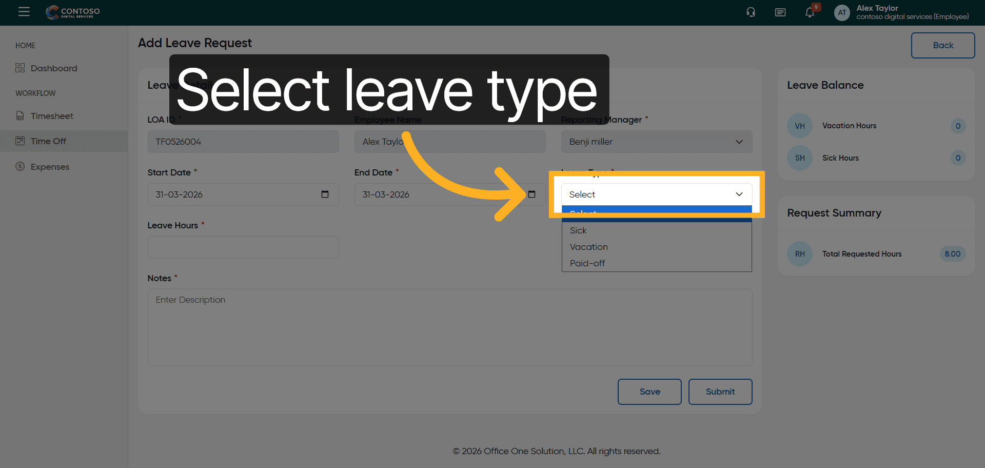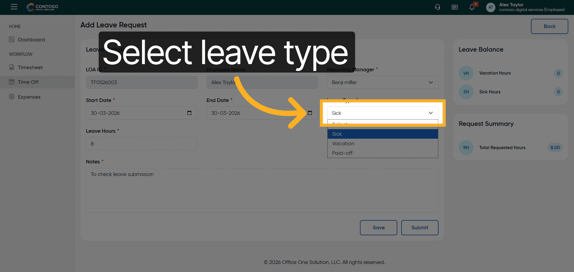 Select the appropriate leave type such as Sick, Vacation, or Paid-off.
