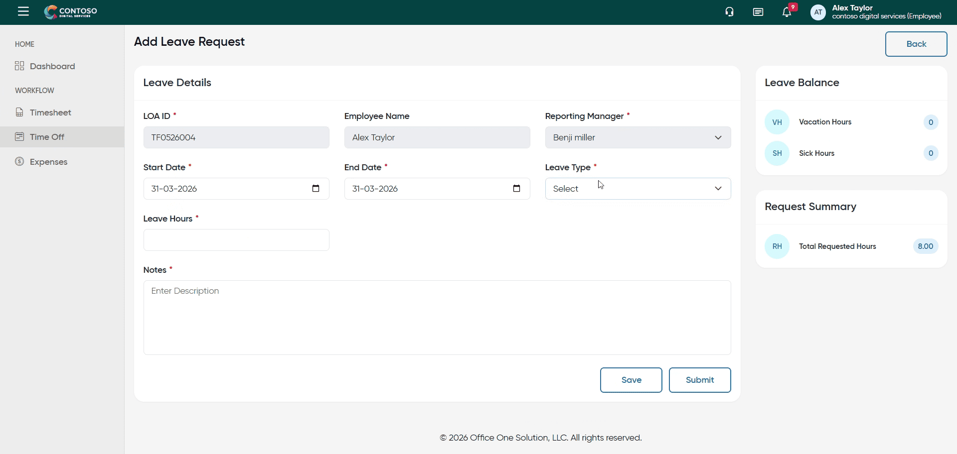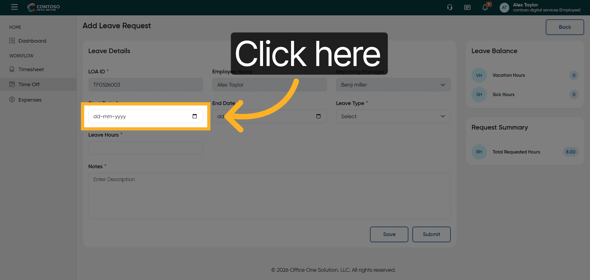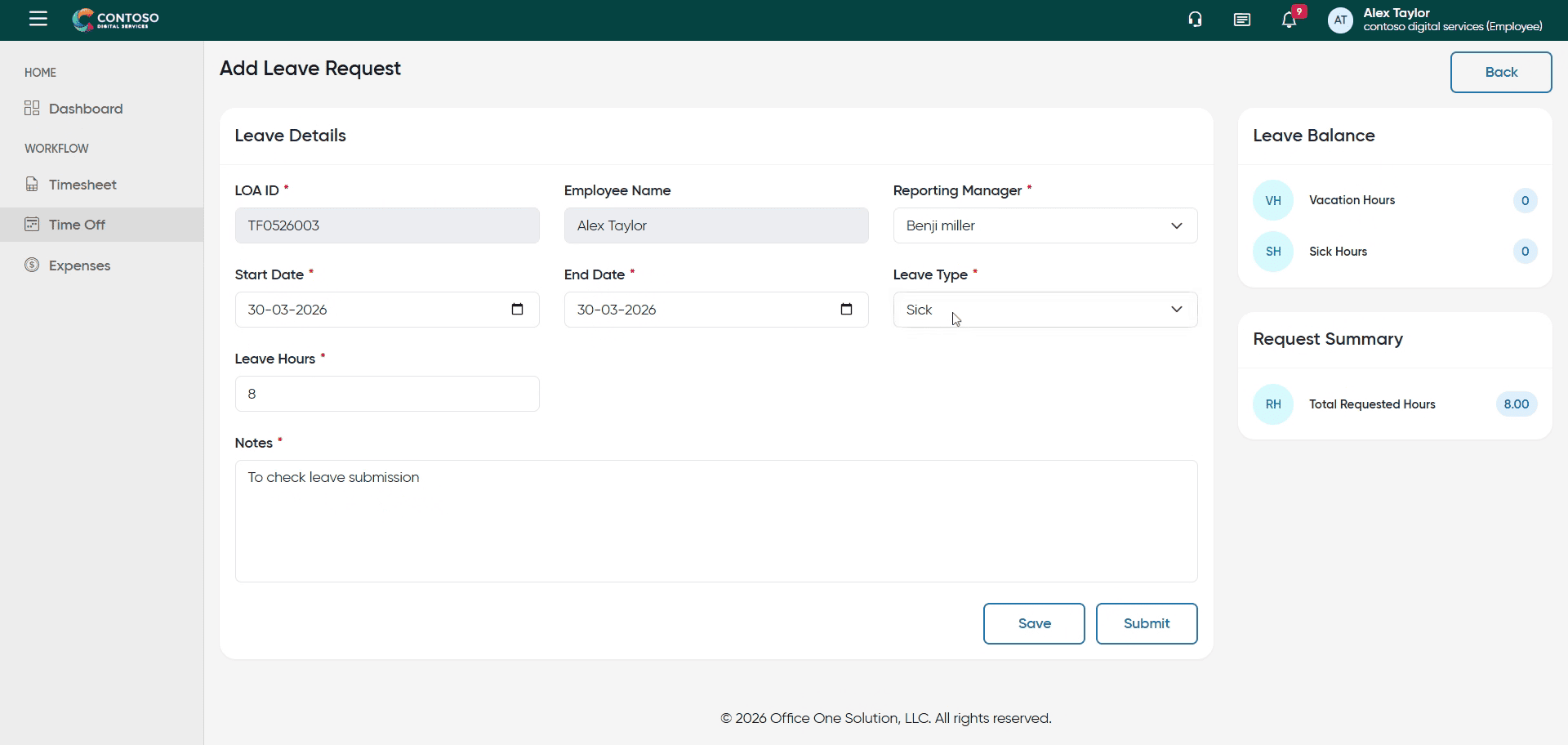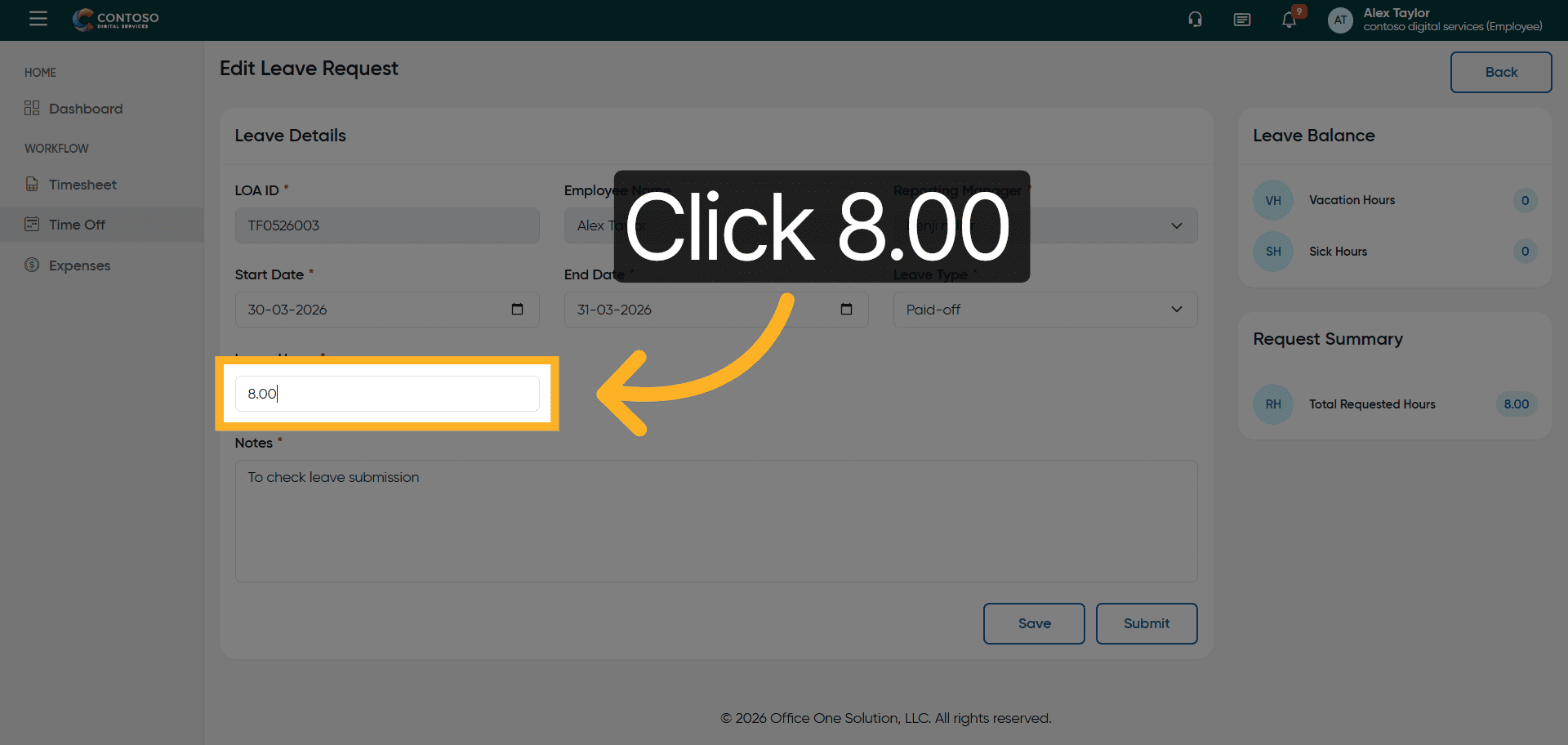 Select the appropriate leave type such as Sick, Vacation, or Paid-off.