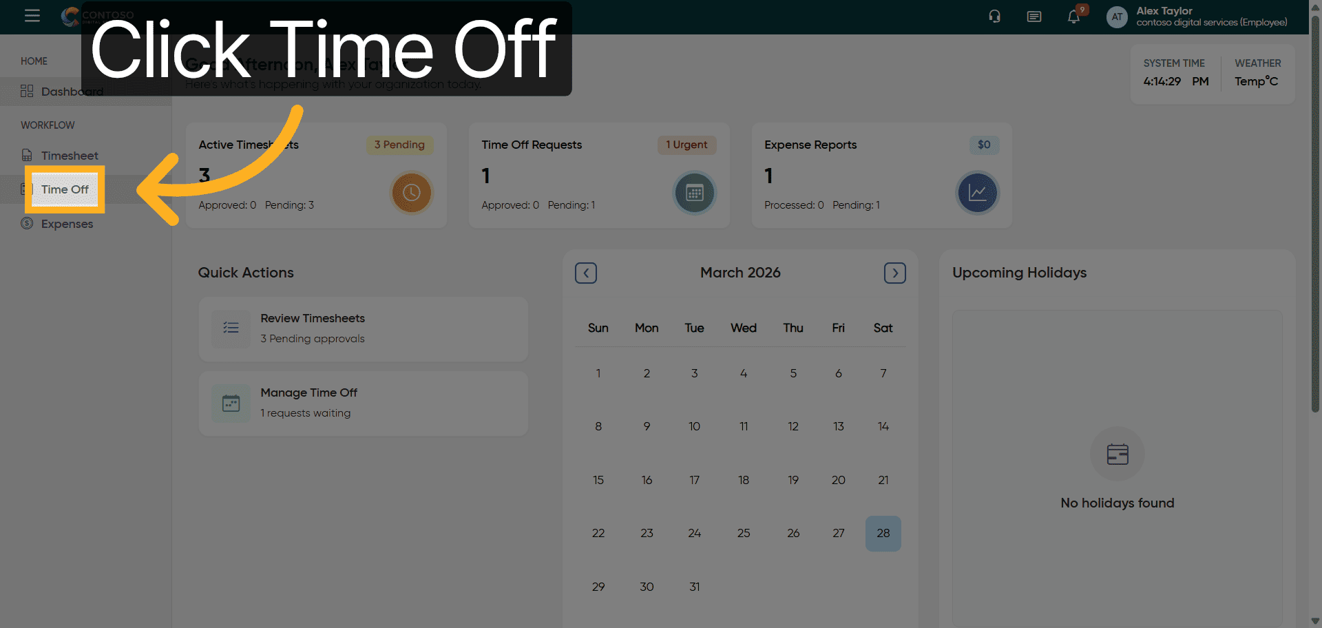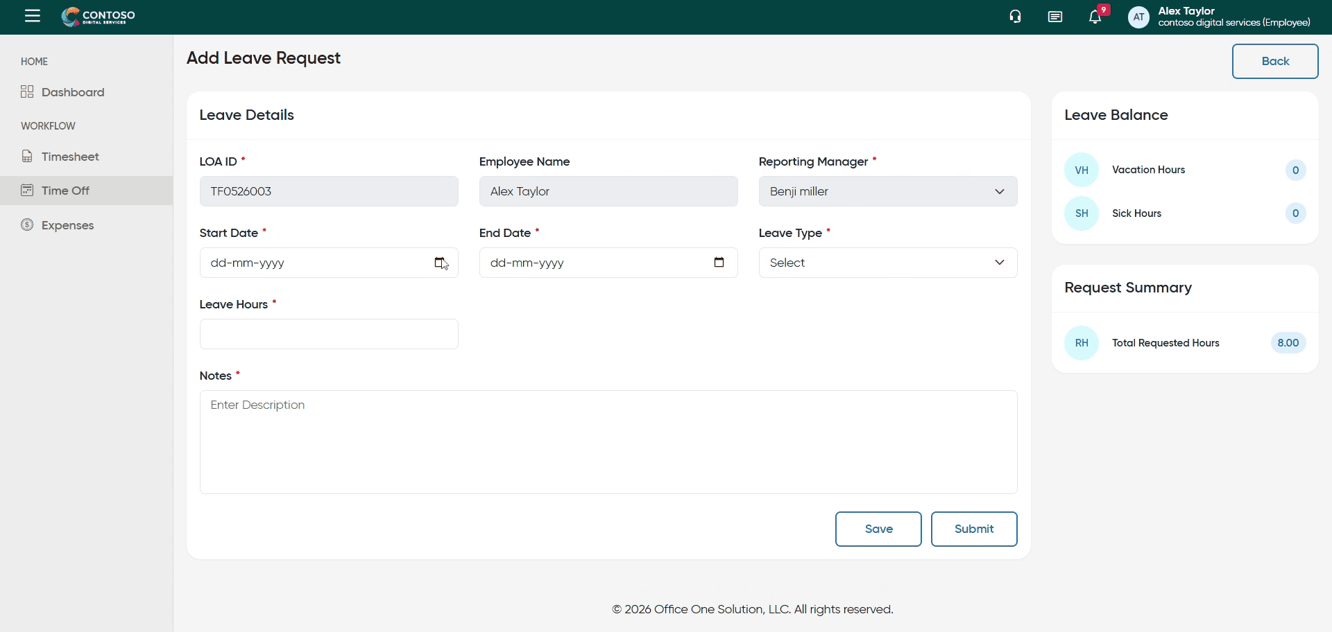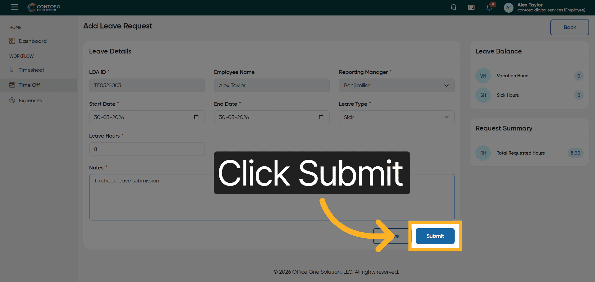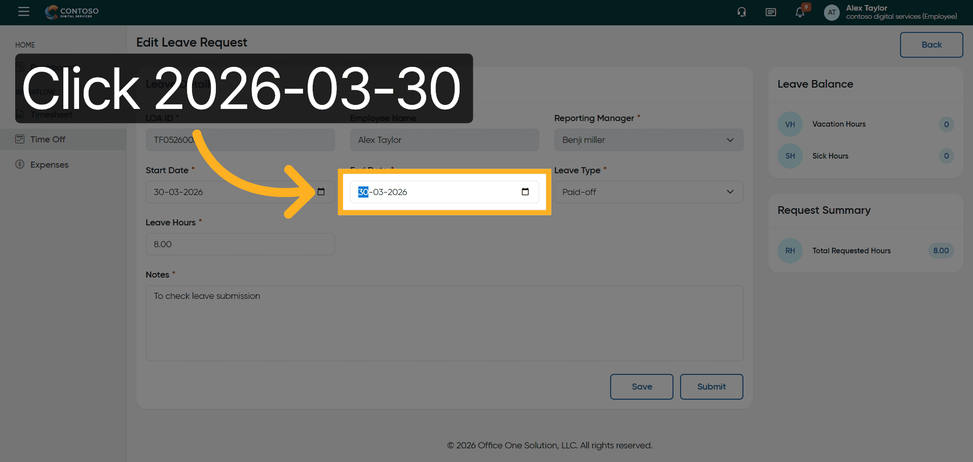 Select the appropriate leave type such as Sick, Vacation, or Paid-off.