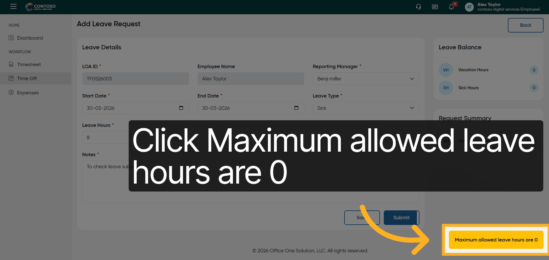 Click the message indicating maximum allowed leave hours are 0 to review limits.