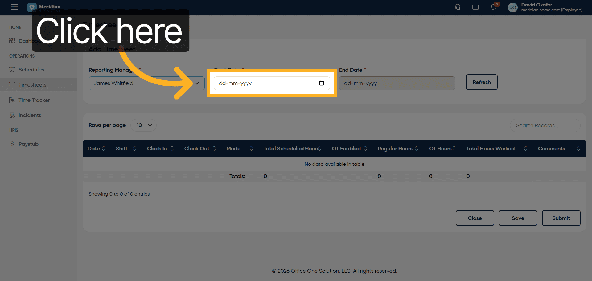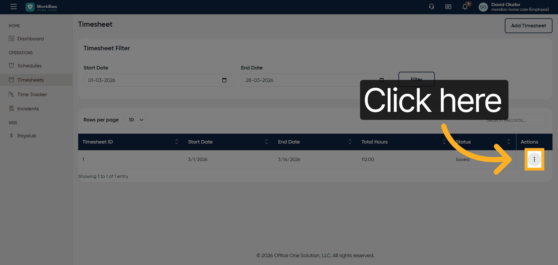 Click the Timesheets section to begin managing your work hours.