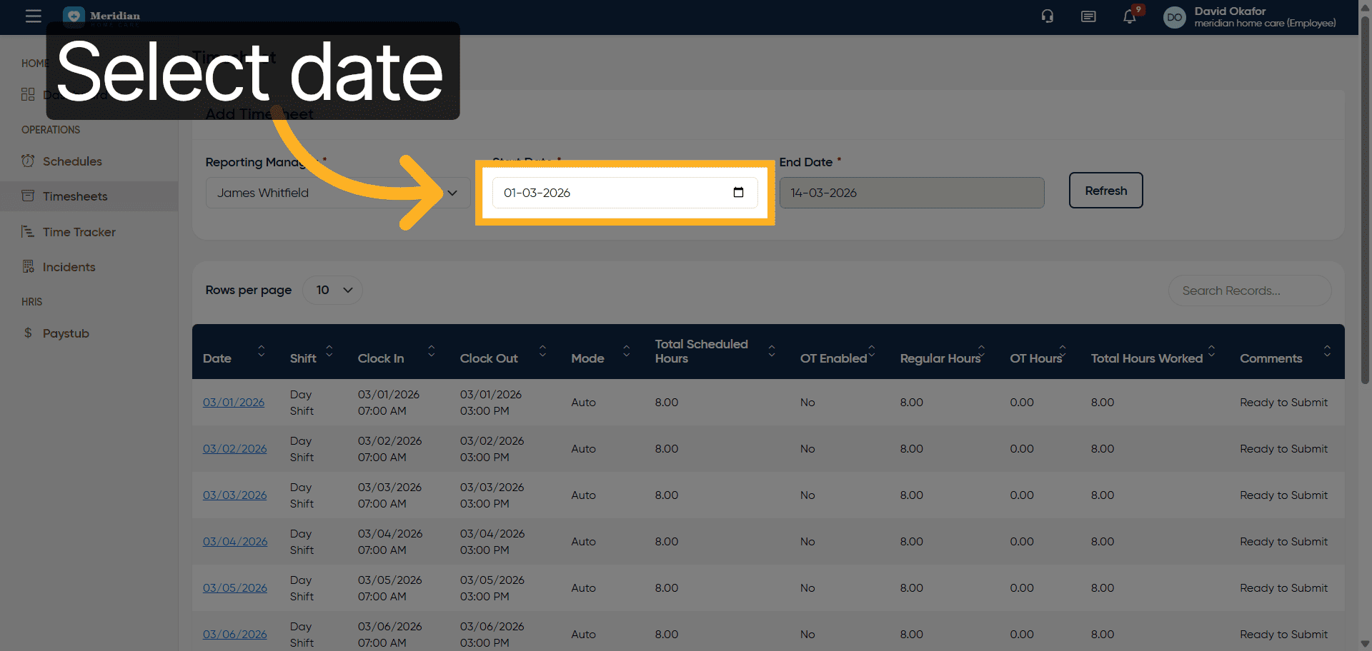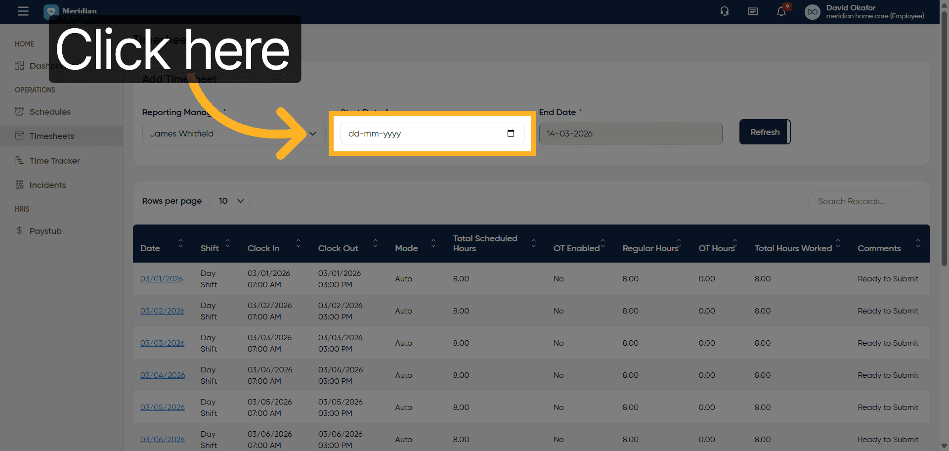 Fill in the start date for the timesheet period, for example, 2026-03-01.