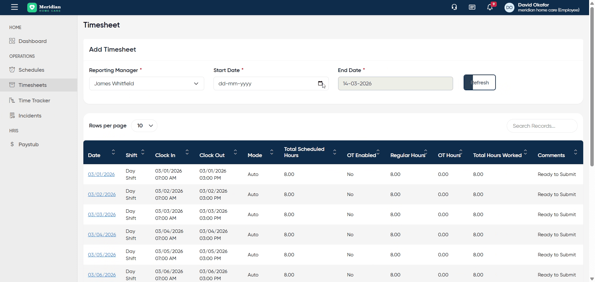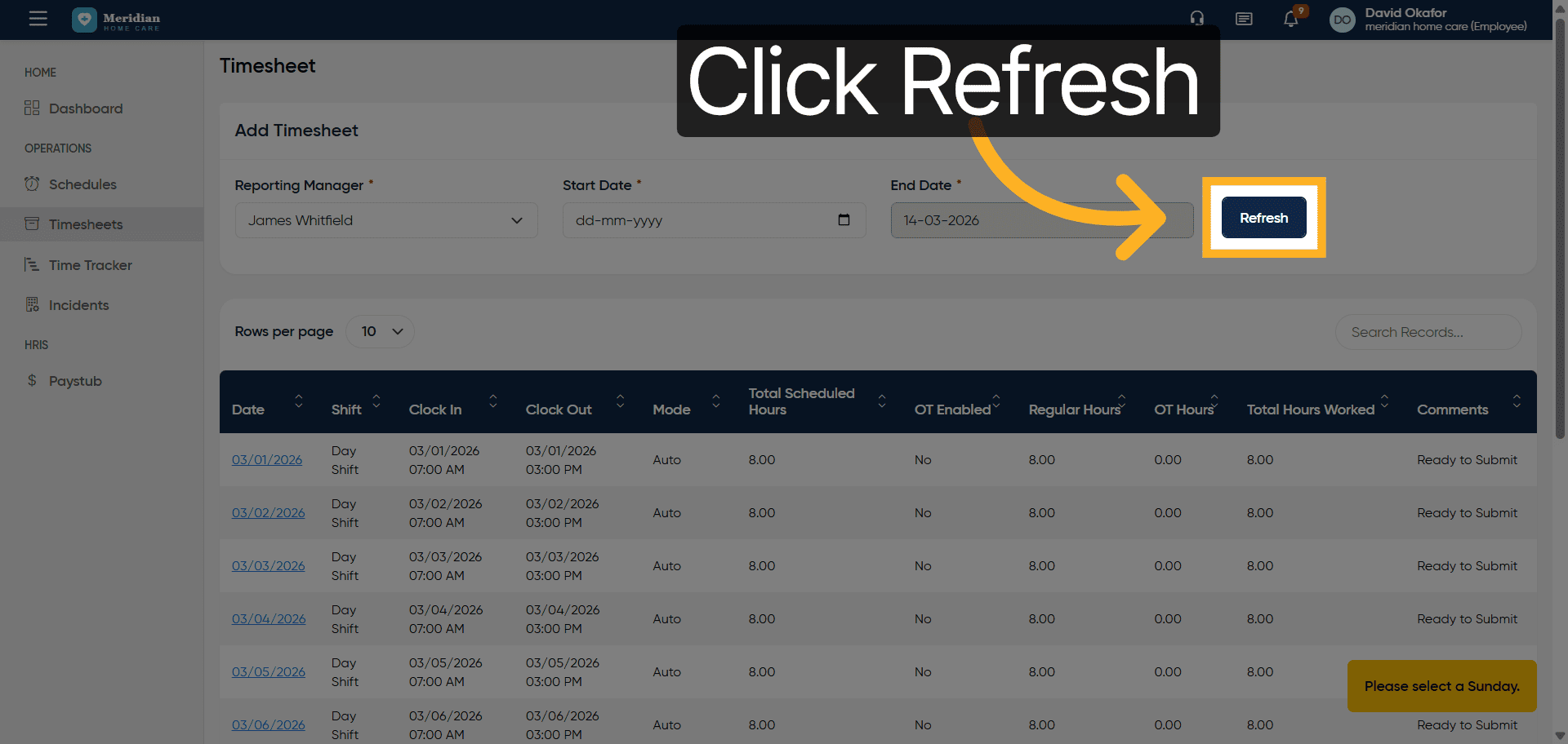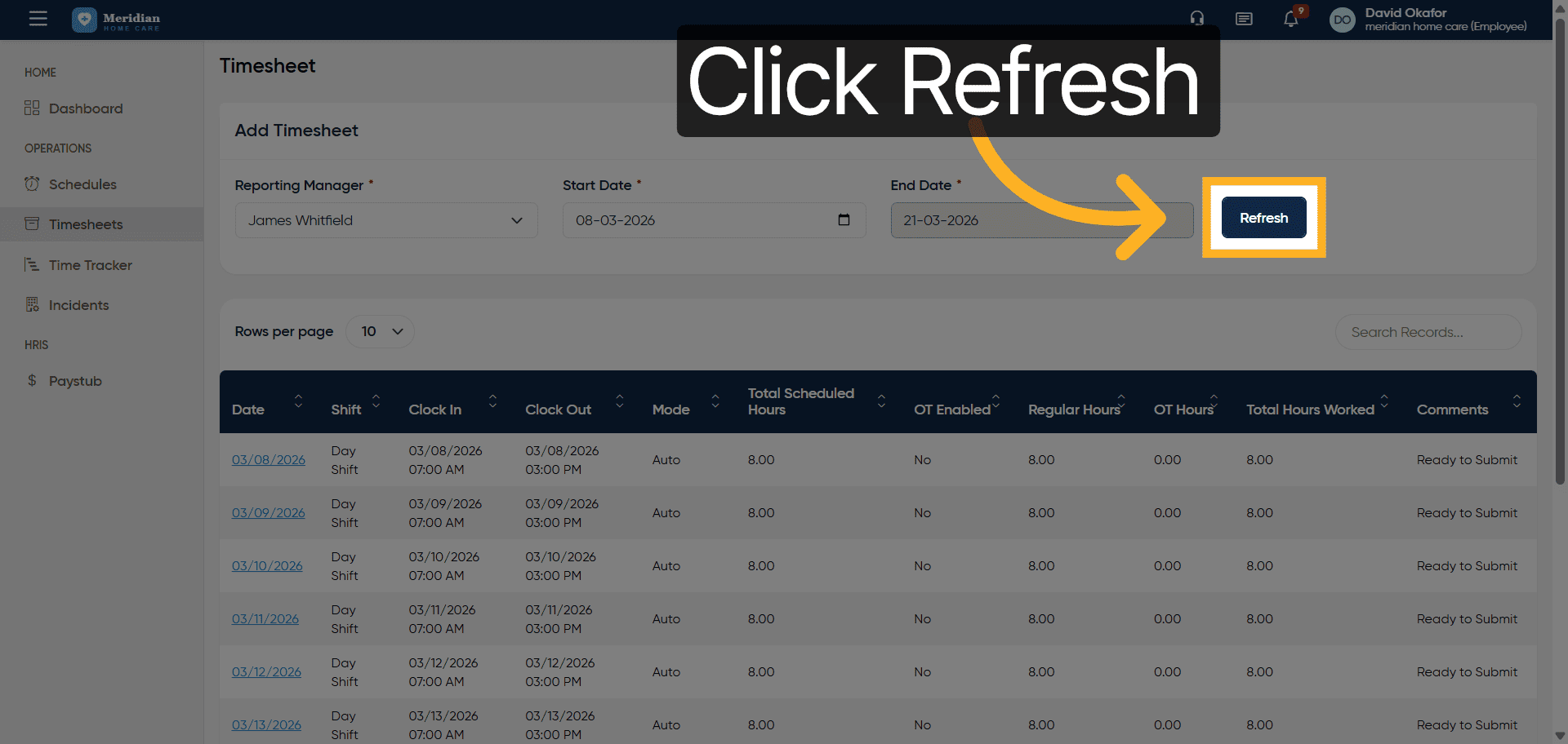 Click Refresh to update the timesheet view with the latest information.