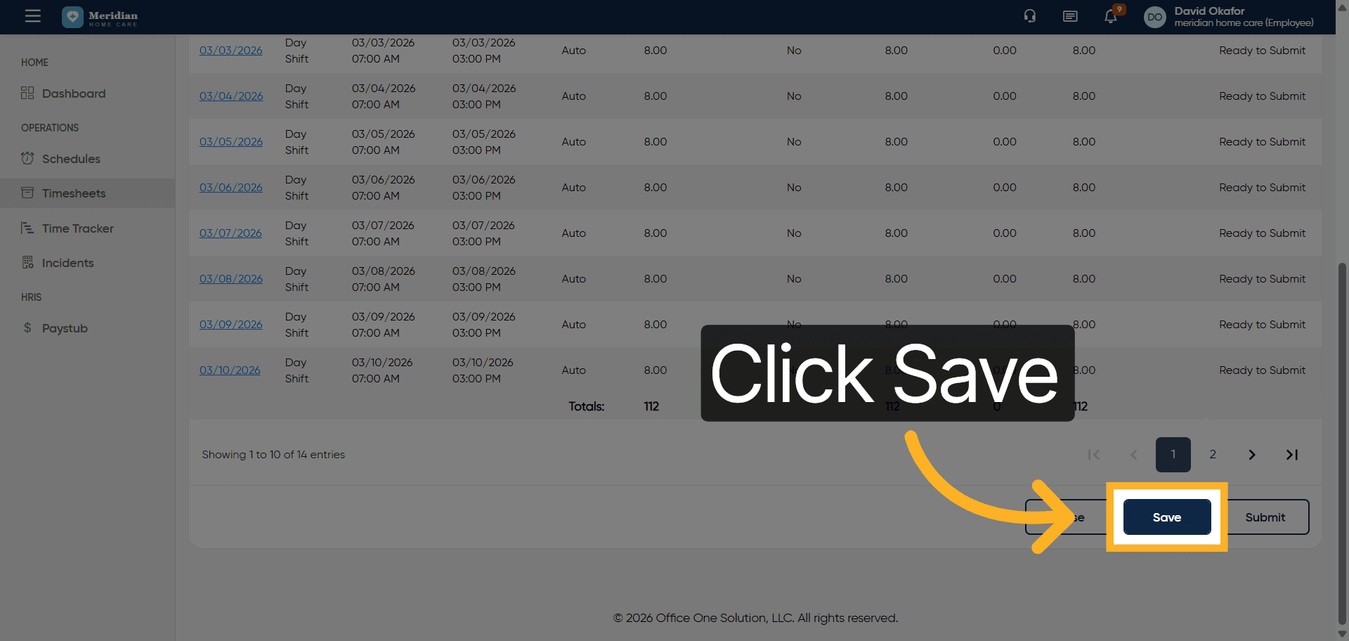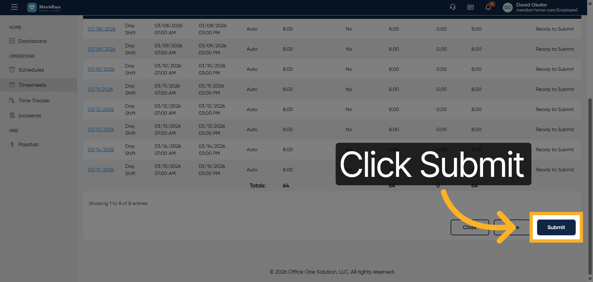 Click the Submit button to finalize and send the timesheet for approval.