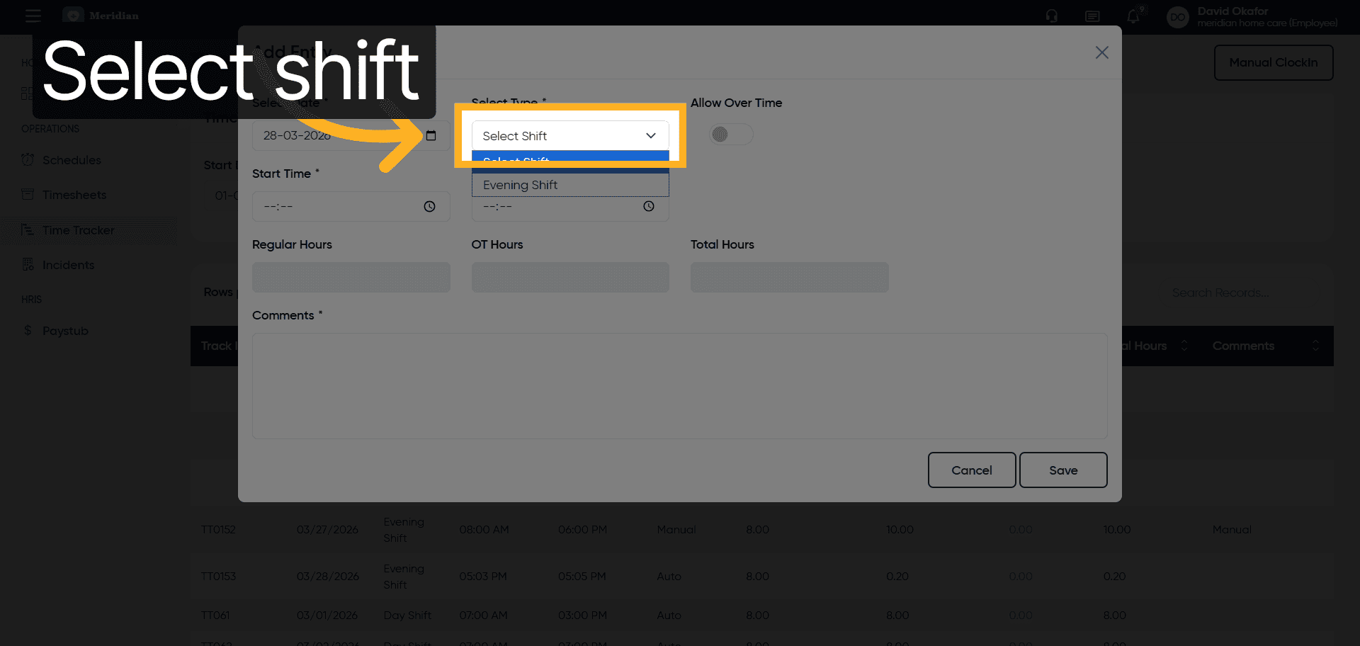Click to select the shift you are clocking in for, such as the Evening Shift.