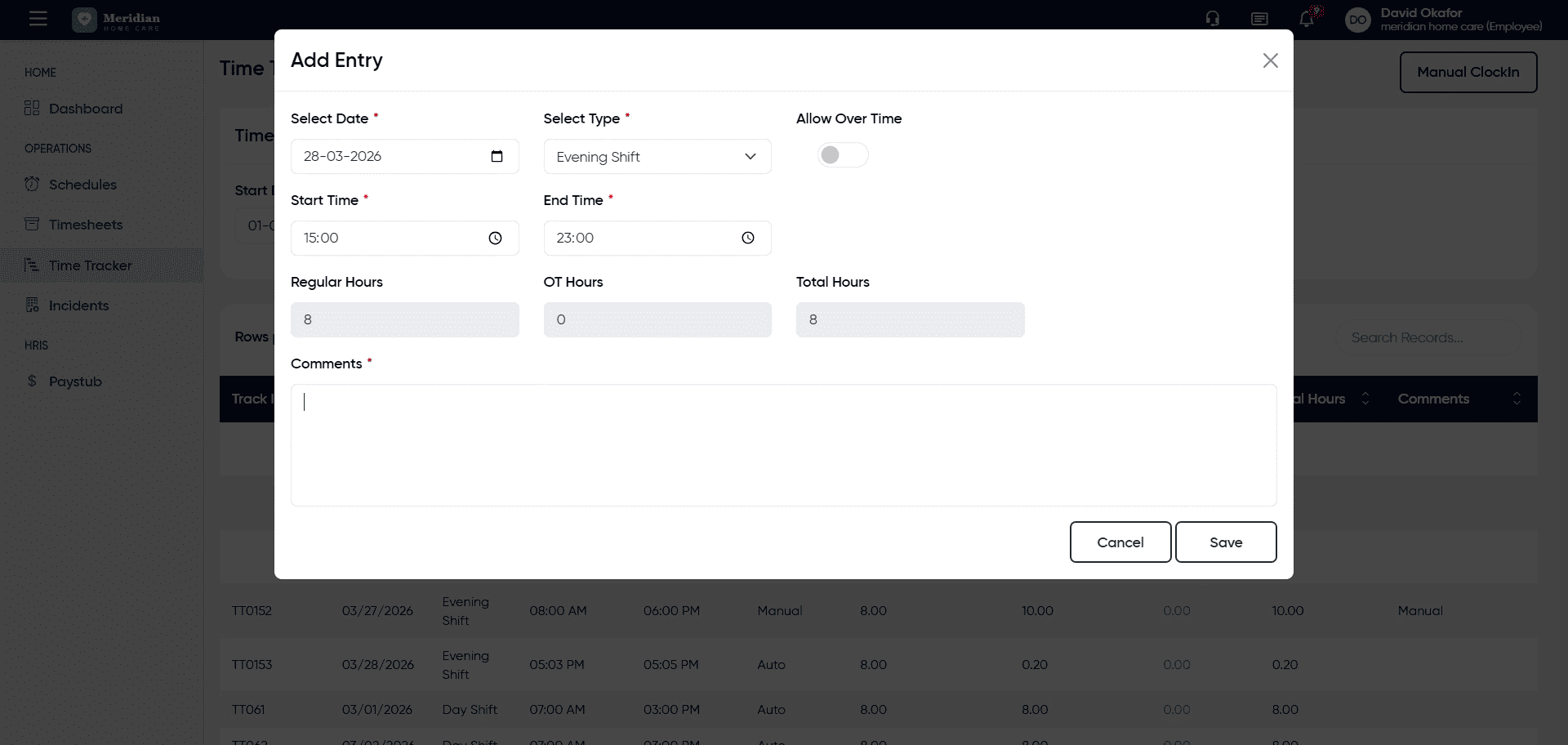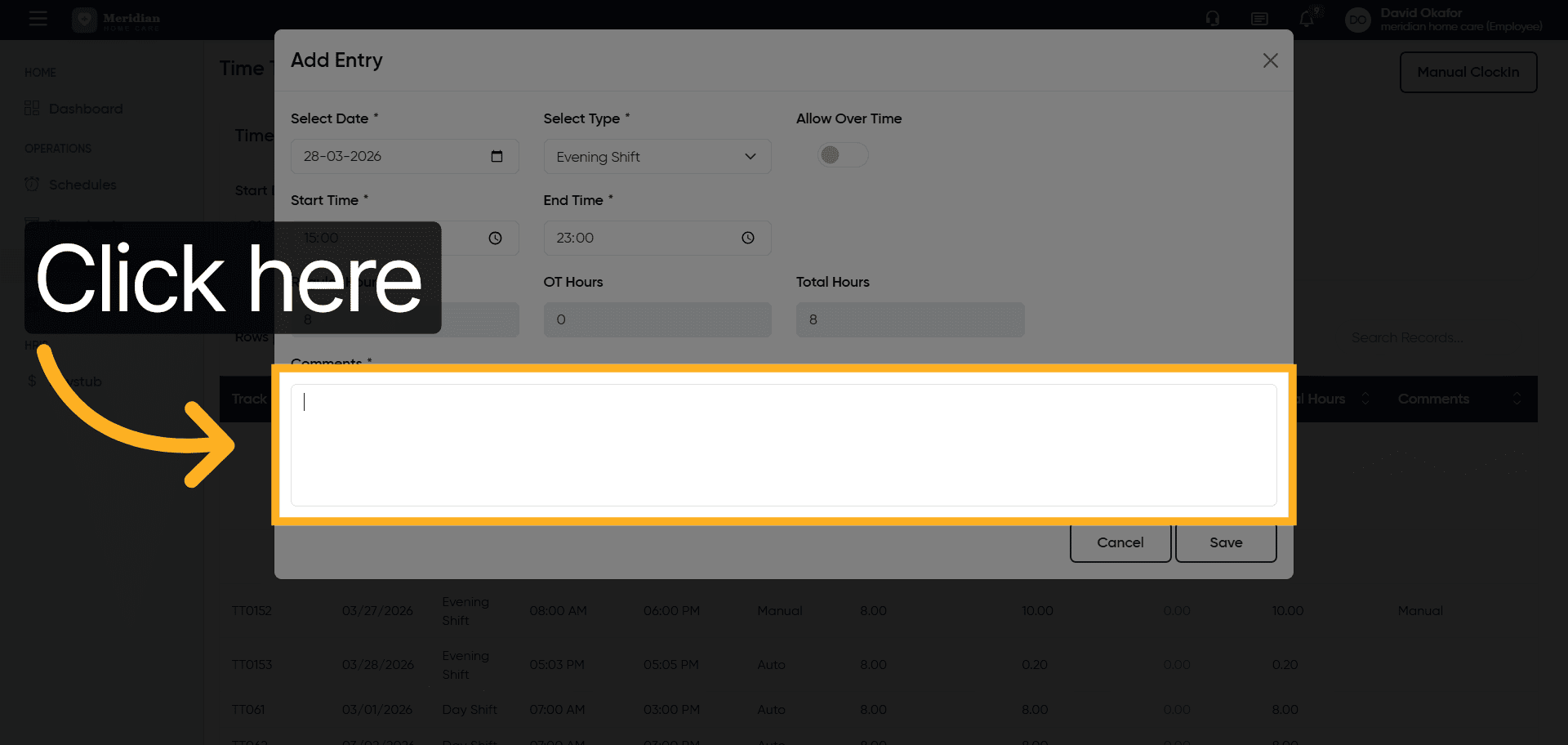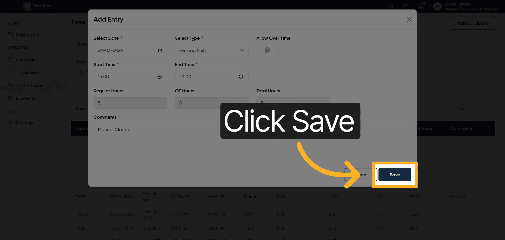 Click the Save button to store your manual clock-in information.