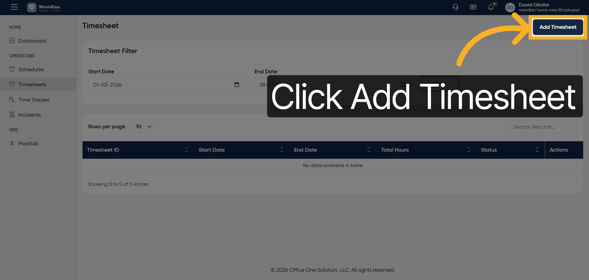 Click the Add Timesheet button to start entering a new timesheet record.